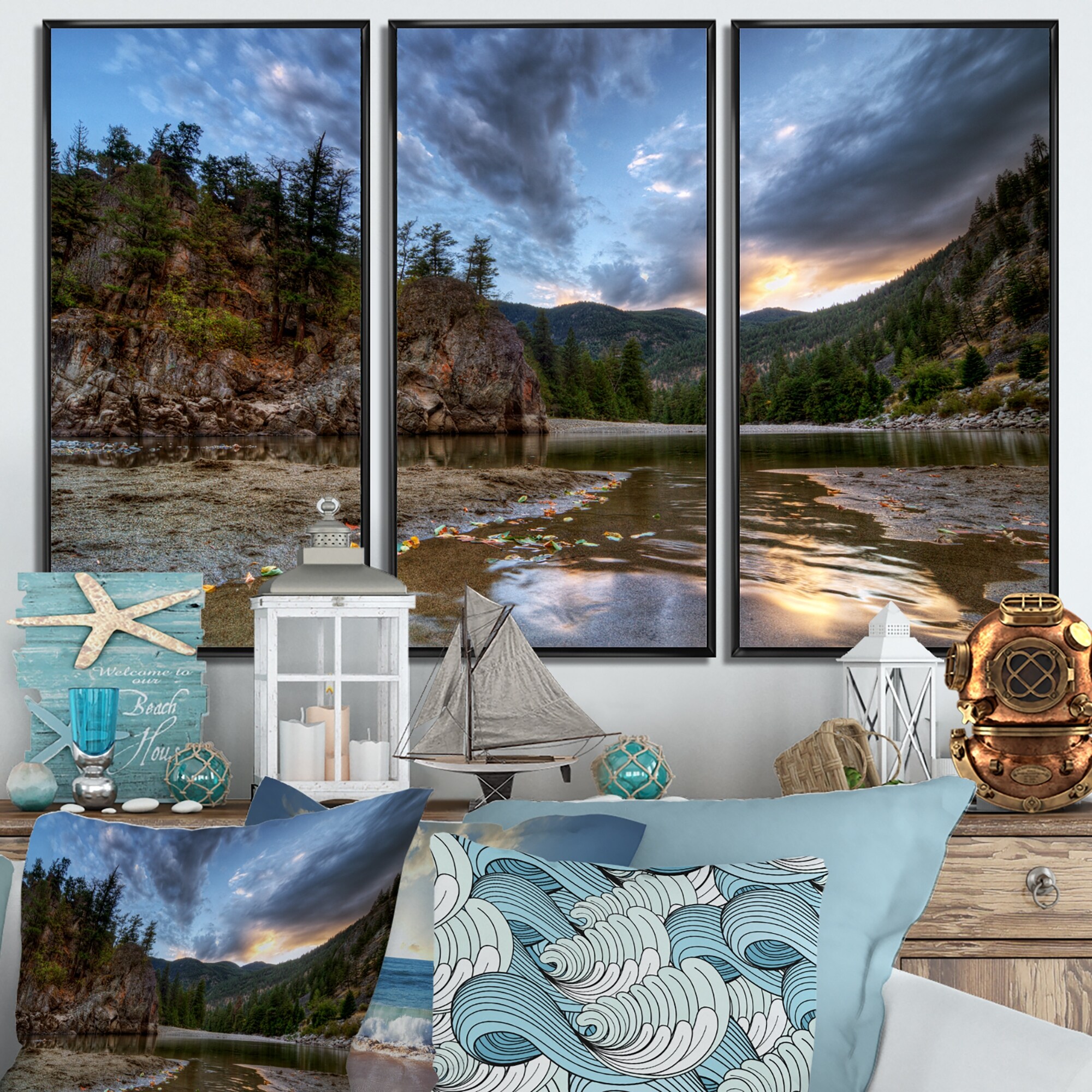 Designart "Peaceful Evening at Mountain Creek" Landscape Framed Wall Art Set of 3 - 4 Colors of Frames