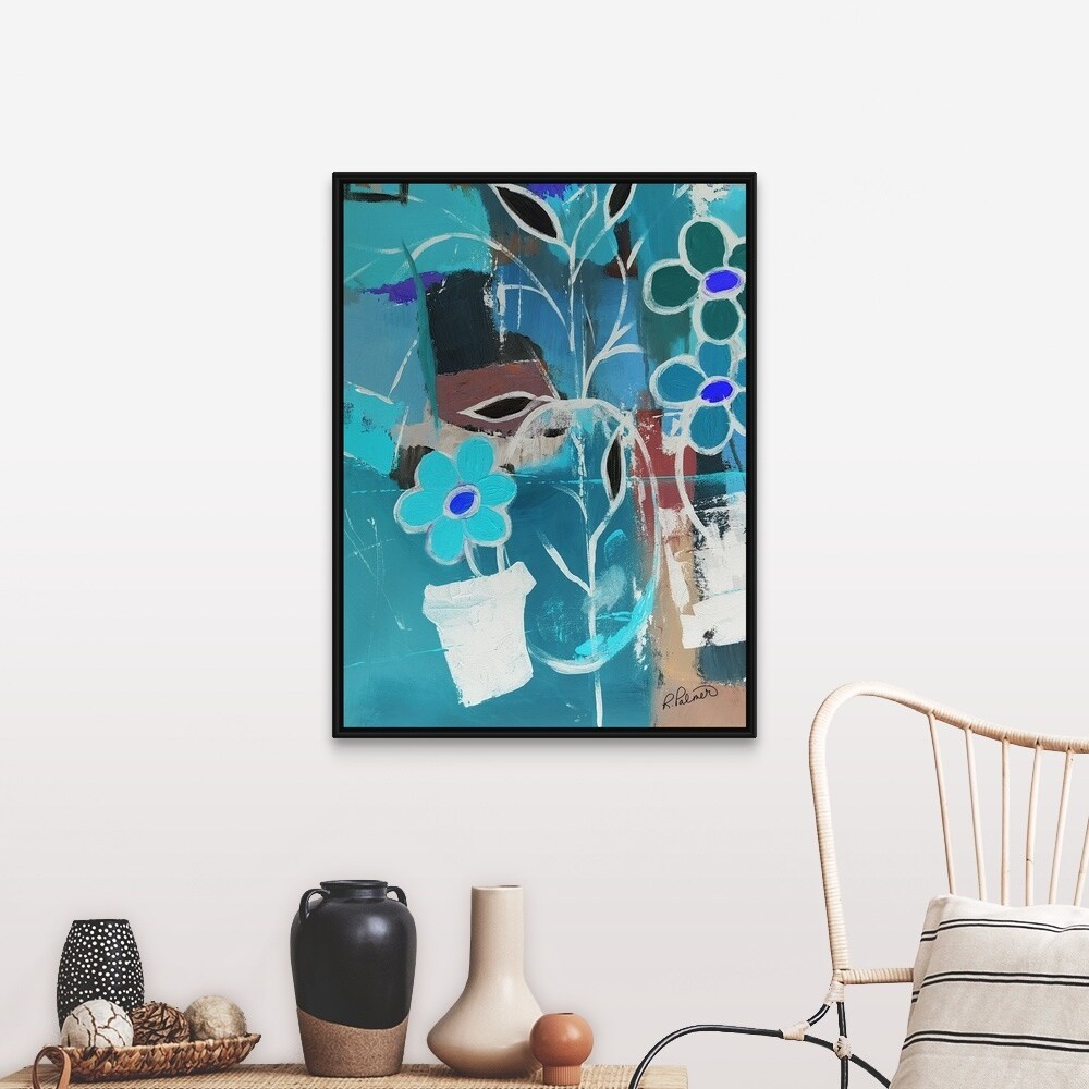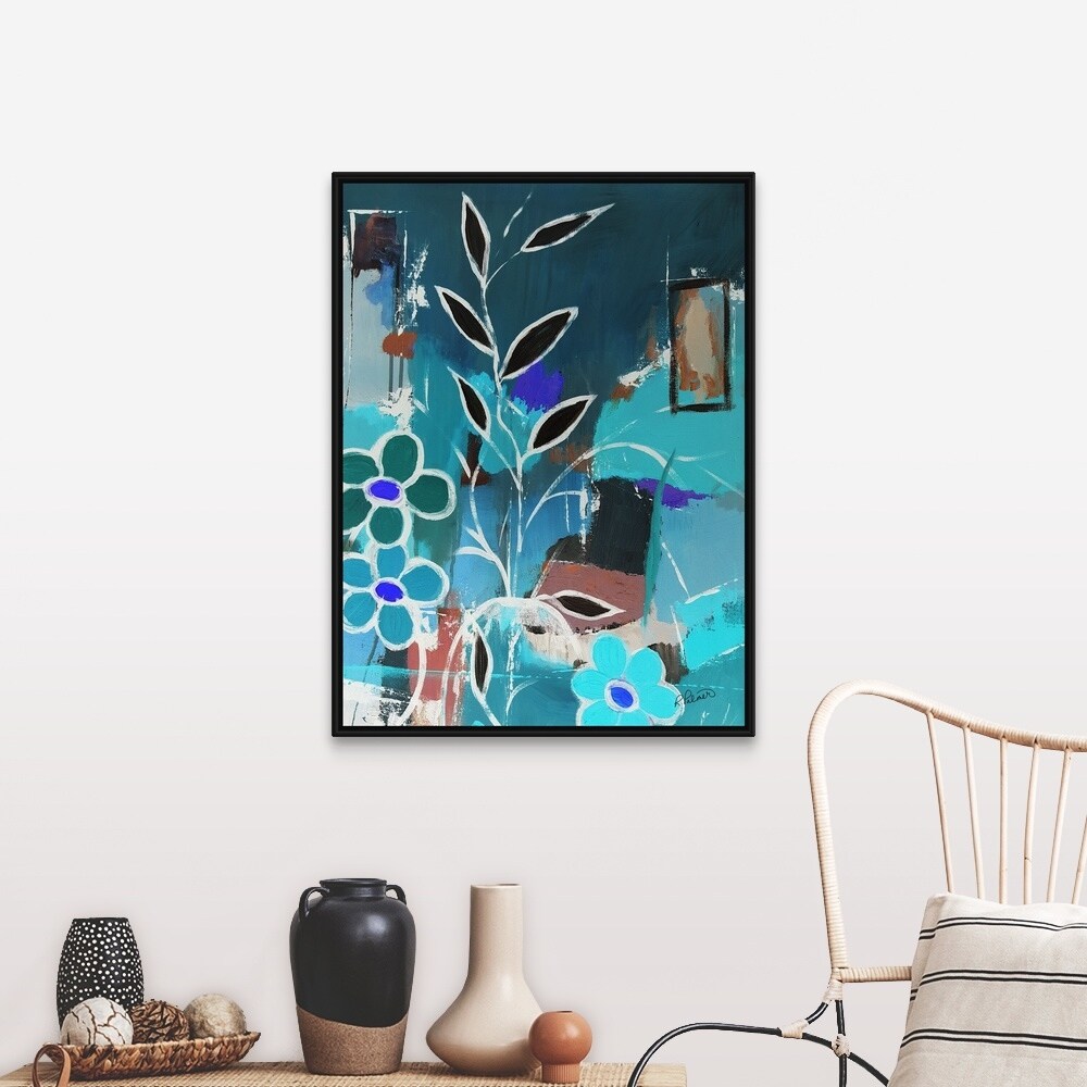 "Funky Floral Blue A" Black Float Frame Canvas Art