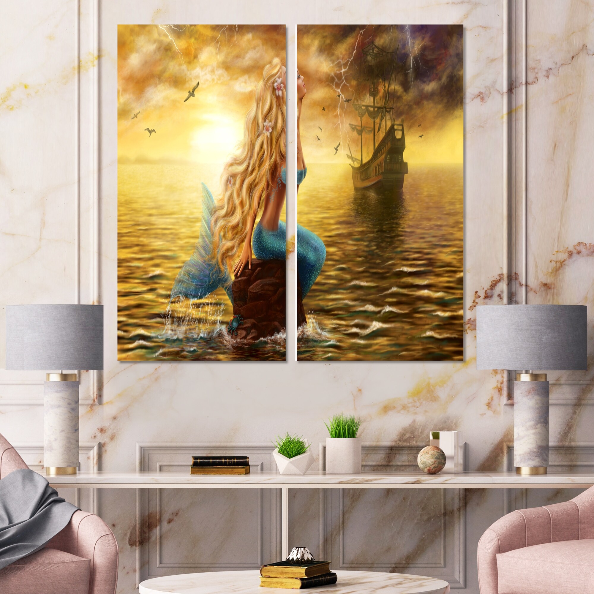 Designart "Sea Mermaid with Ghost Ship" Seascape Canvas Wall Art Print 2 Piece Set