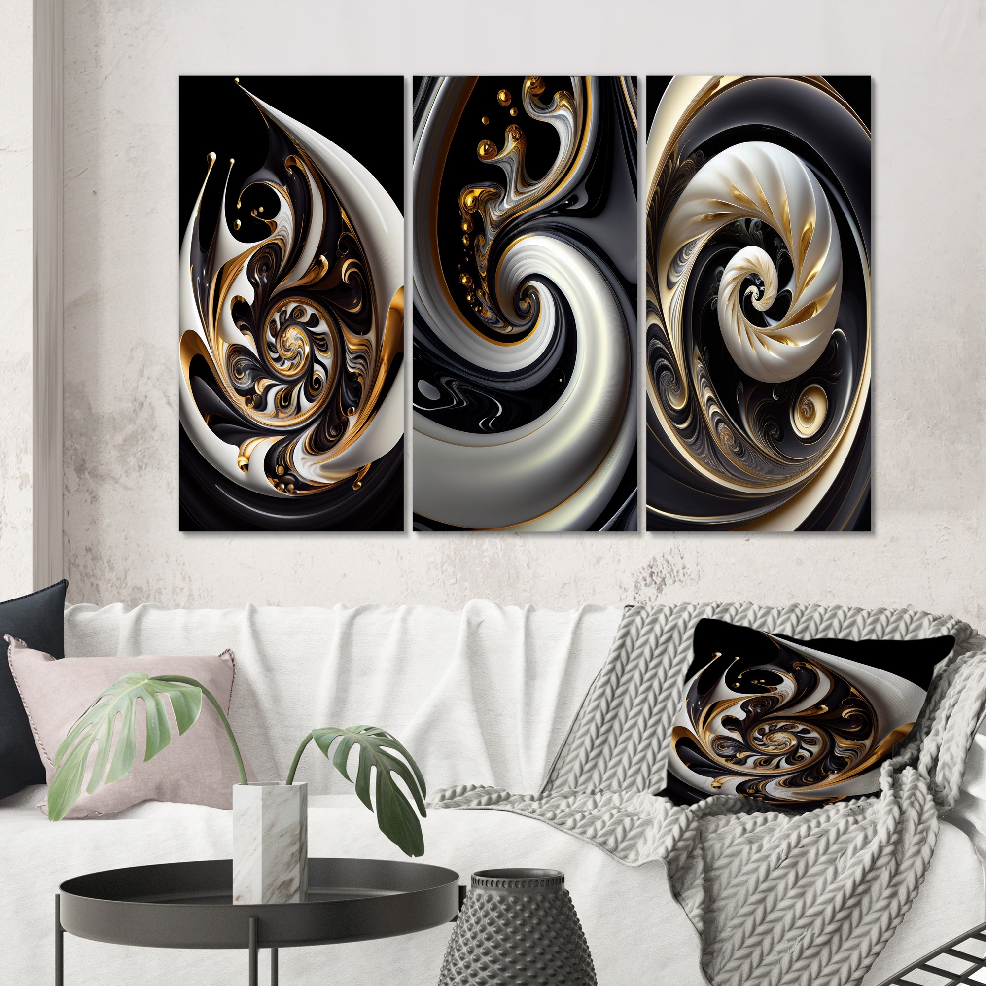 Designart "Gold Black And White Stained Glass II" Modern Spiral Canvas Prints Set of 3 Pieces