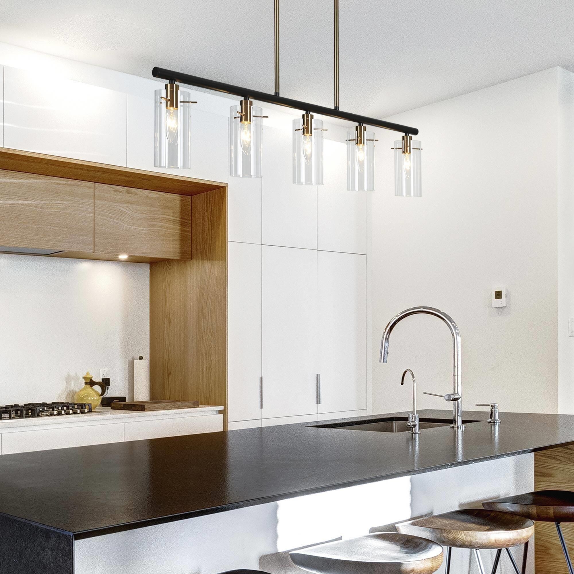 Modern Farmhouse 5-Light 36" L Black Gold Linear Chandelier Cylinder Glass Island Lights for Dining Room - 36" L x 3" W x 8" H