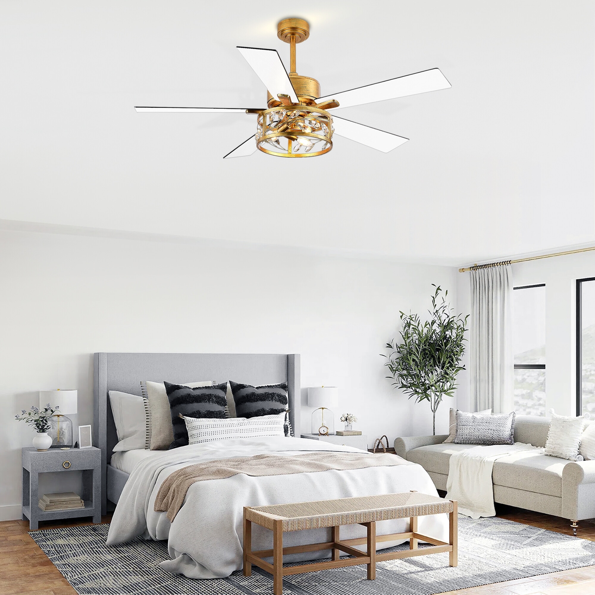 52" 5 Blade Vintage Gold Ceiling Fans with Crystal Lights Remote Control - 52 Inch