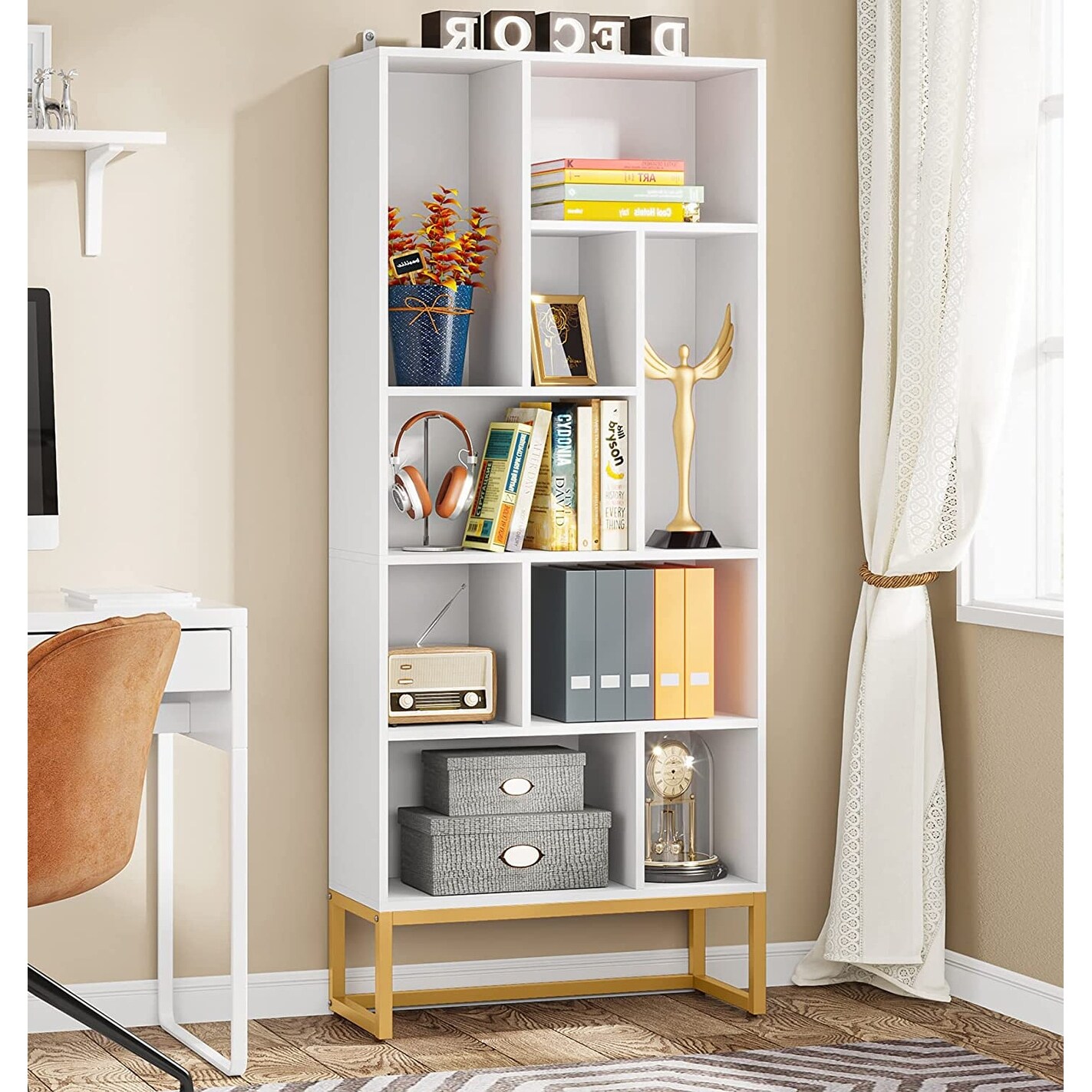 Tribesigns White 5-Tier Open Tall Bookshelf and Bookcases with Gold Metal Base