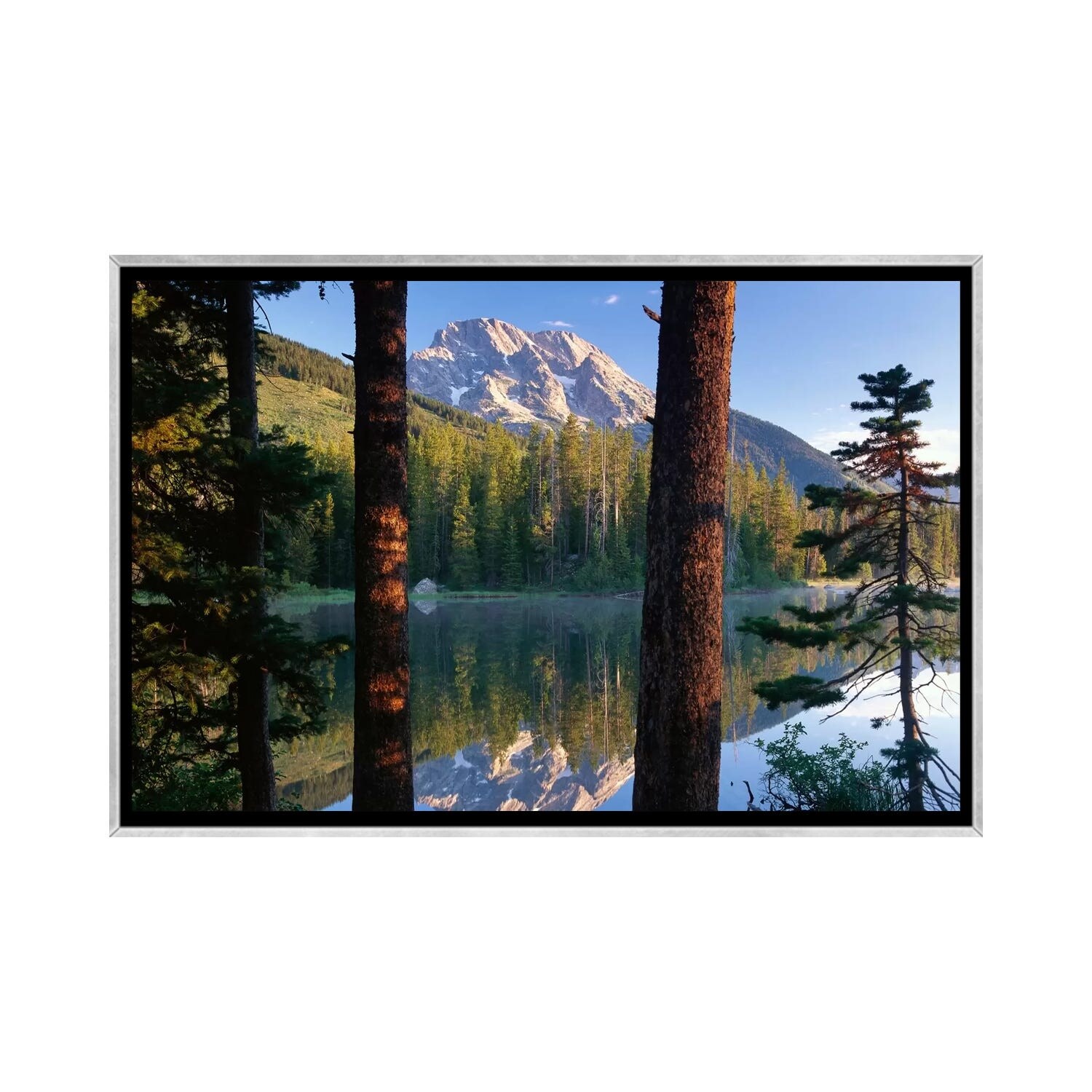 "Reflection of pine trees in lake at sunrise, Grand Teton National Park." Black Float Frame Canvas Art