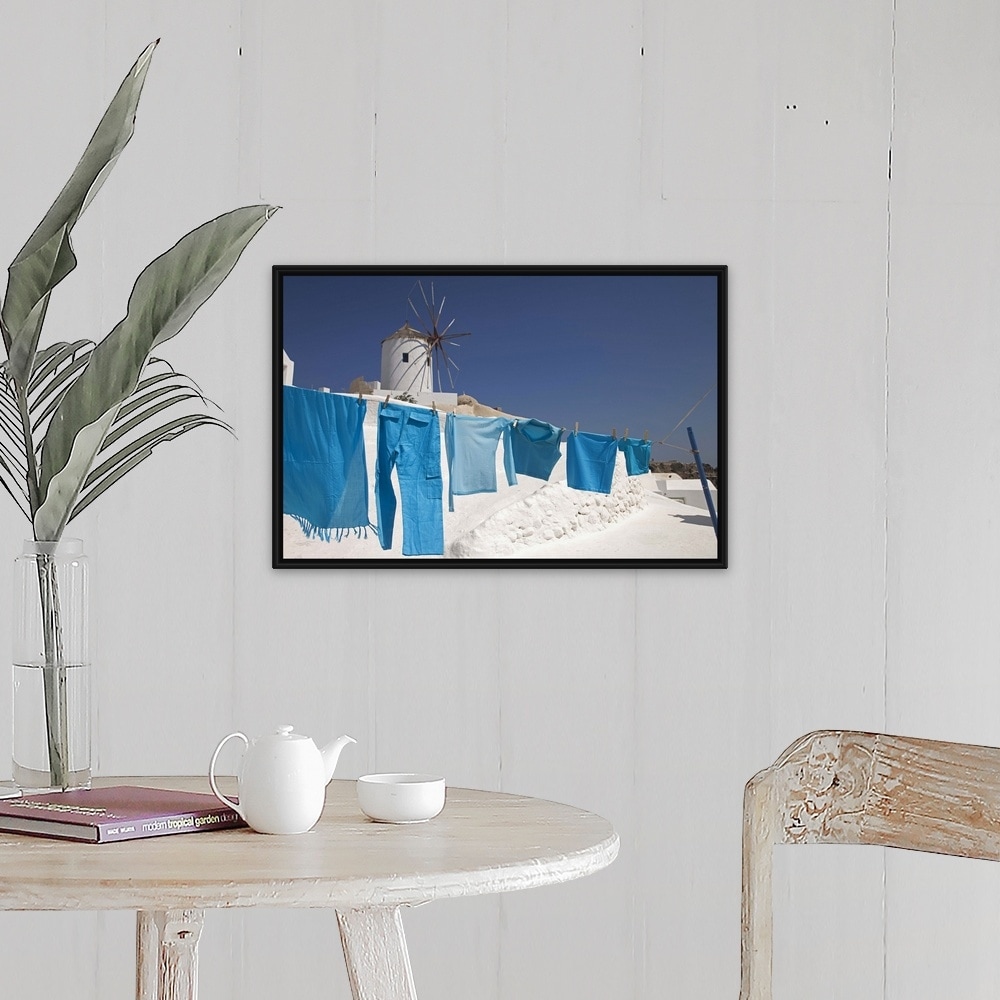 "Clothes hanging to dry near a windmill in Oia, Santorini, Greece" Black Float Frame Canvas Art