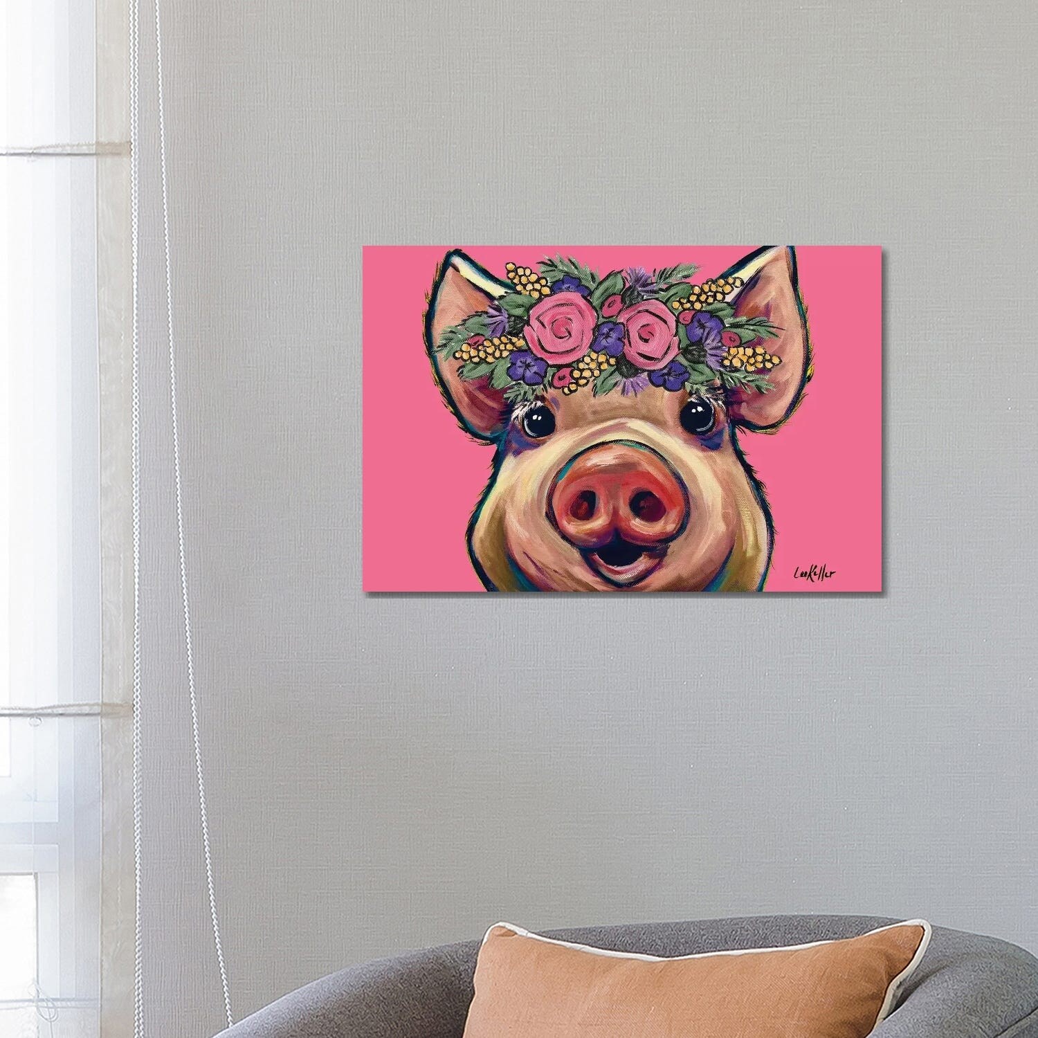 iCanvas "Marmalade The Pig With Flowers on Pink" by Hippie Hound Studios Canvas Print