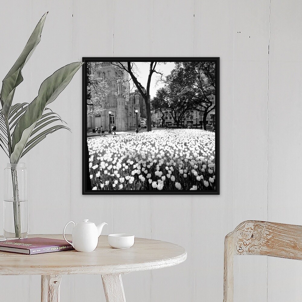 "White tulips near a water tower, Chicago Water Tower, Michigan Avenue, Illinois" Black Float Frame Canvas Art
