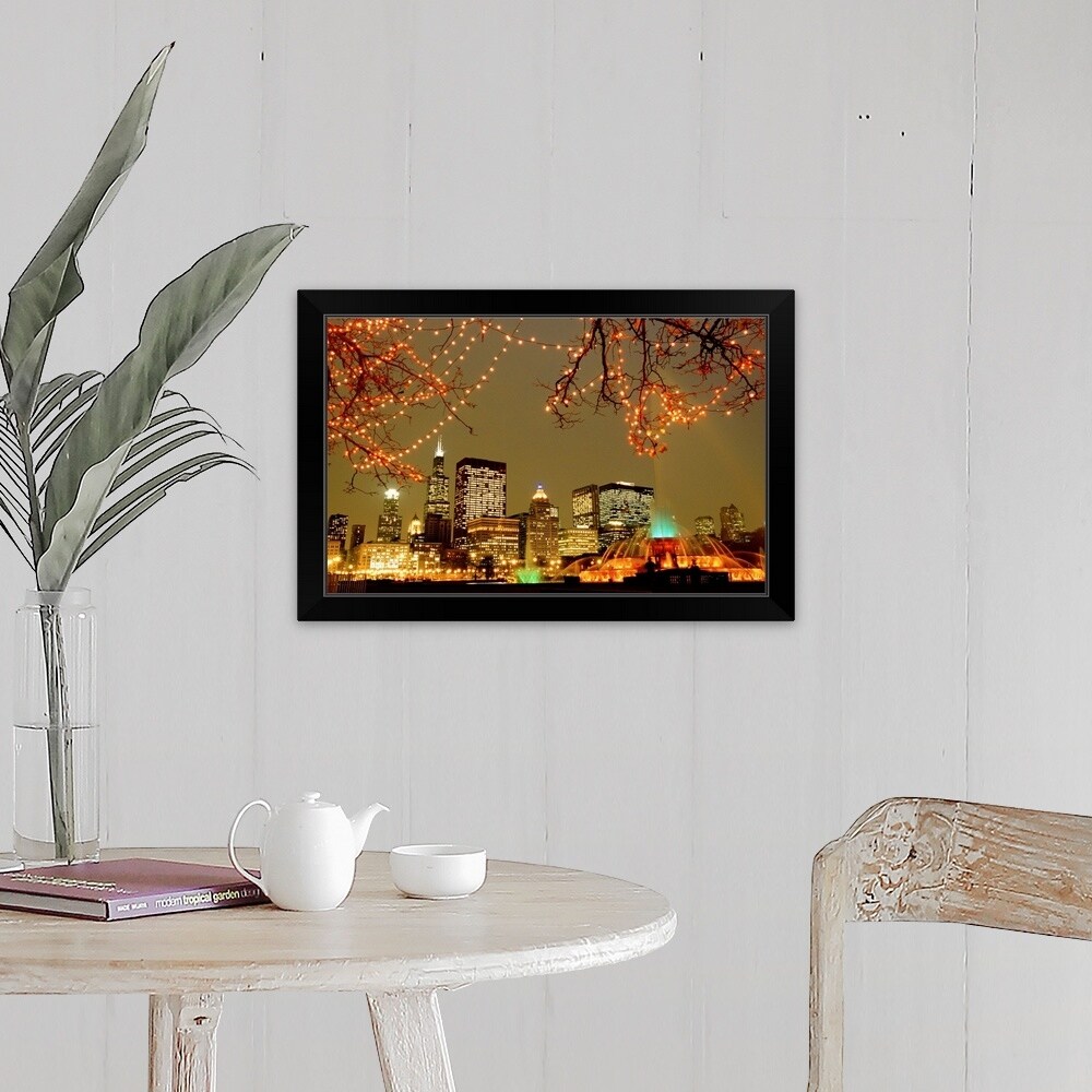 "Illinois, Chicago, skyline and Grant Park at night" Black Framed Print