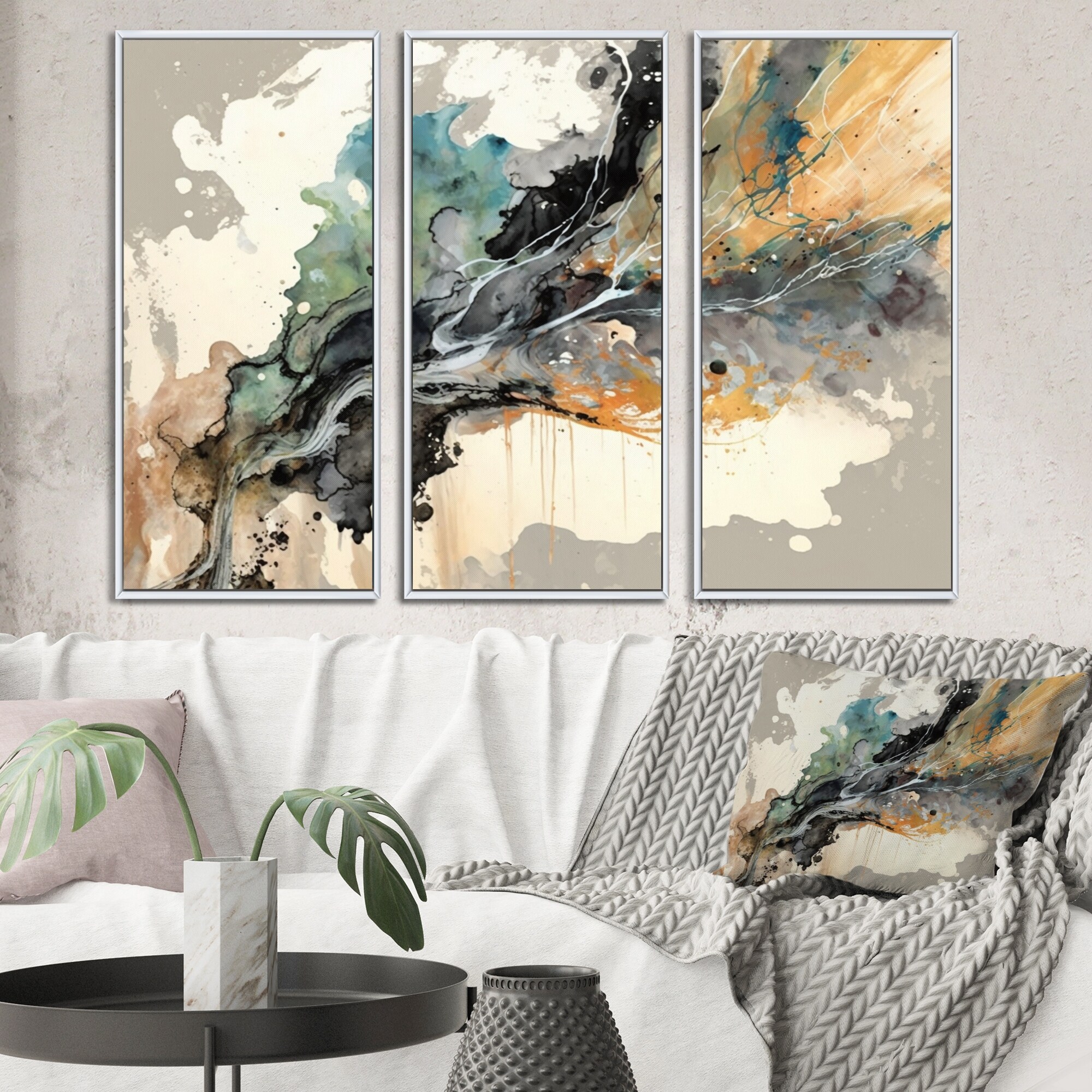Designart "Jazz Rhythms in Shades of Gray IV" Abstract Liquid Ink Framed Canvas Wall Art Print - 3 Panels