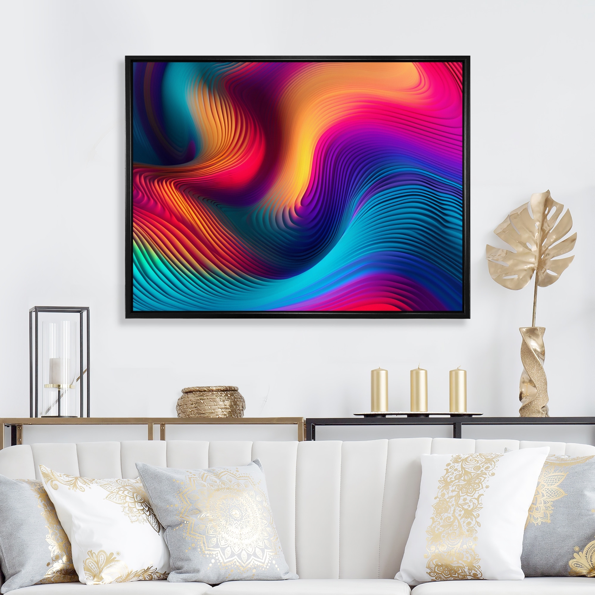 Designart "Blue Pink Dancing Colors" Modern Waves Framed Wall Art Prints