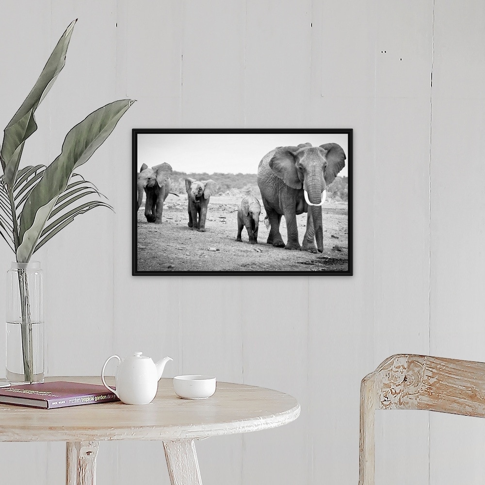 "Female African elephant and three calves, Kenya." Black Float Frame Canvas Art