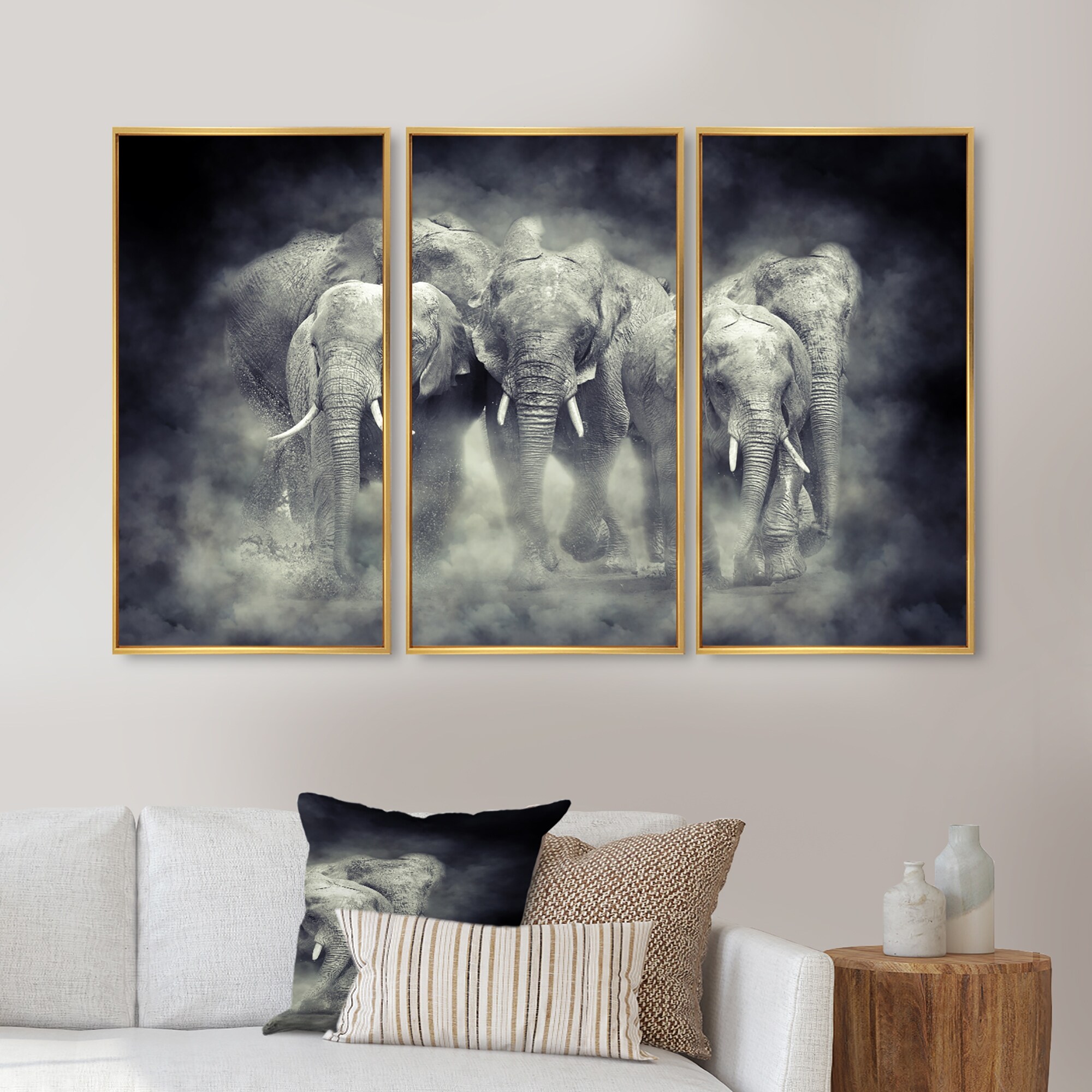 Designart "Kenya National Park Elephant in smoke" Animal Framed Wall Decor Set of 3 - 4 Colors of Frames