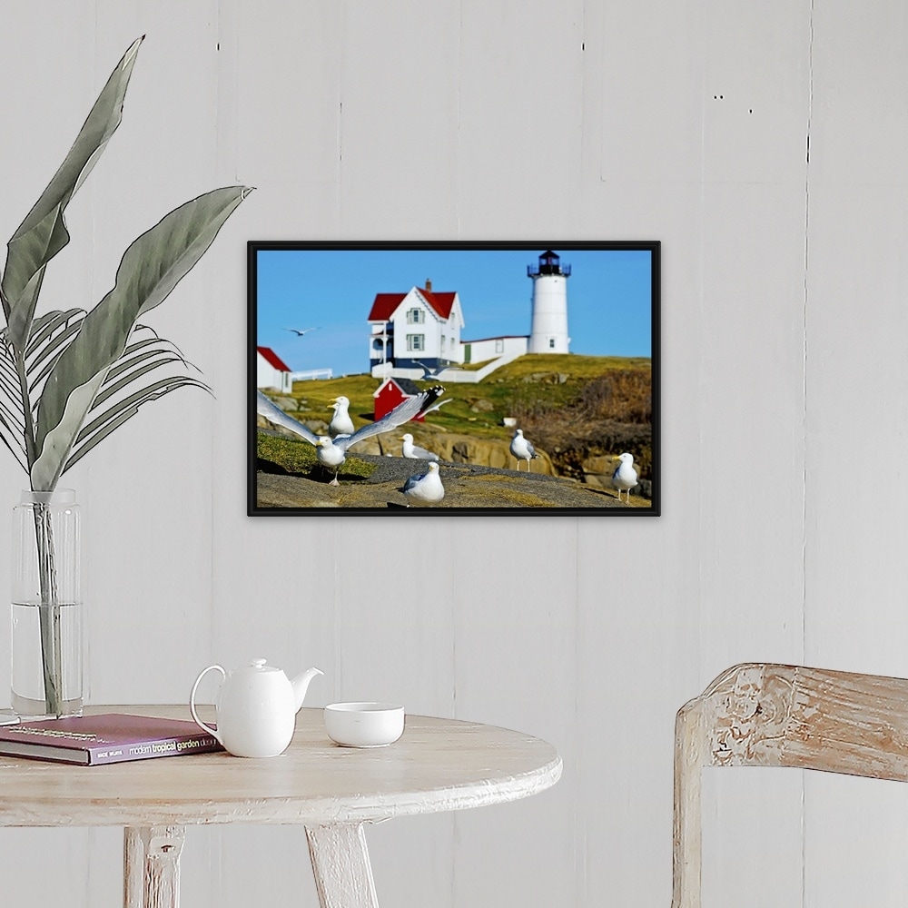 "Seagulls at Nubble Lighthouse, Cape Neddick, York, Maine" Black Float Frame Canvas Art