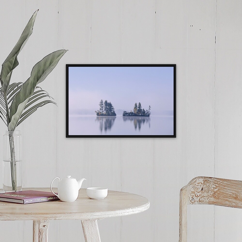 "Islands in morning fog, Maine" Black Float Frame Canvas Art