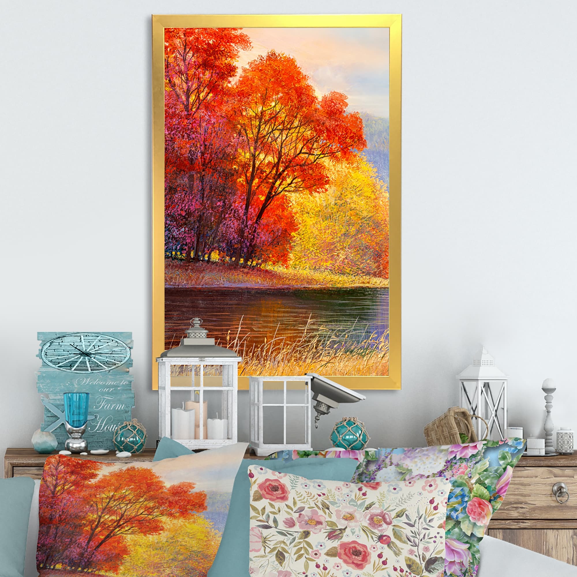 Designart "Lake On Autumn Orange Maple Forest" Traditional Framed Art Print