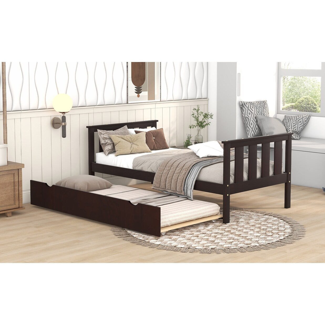 Bed Frame Wood Twin Platform Bed with Pull Out Trundle