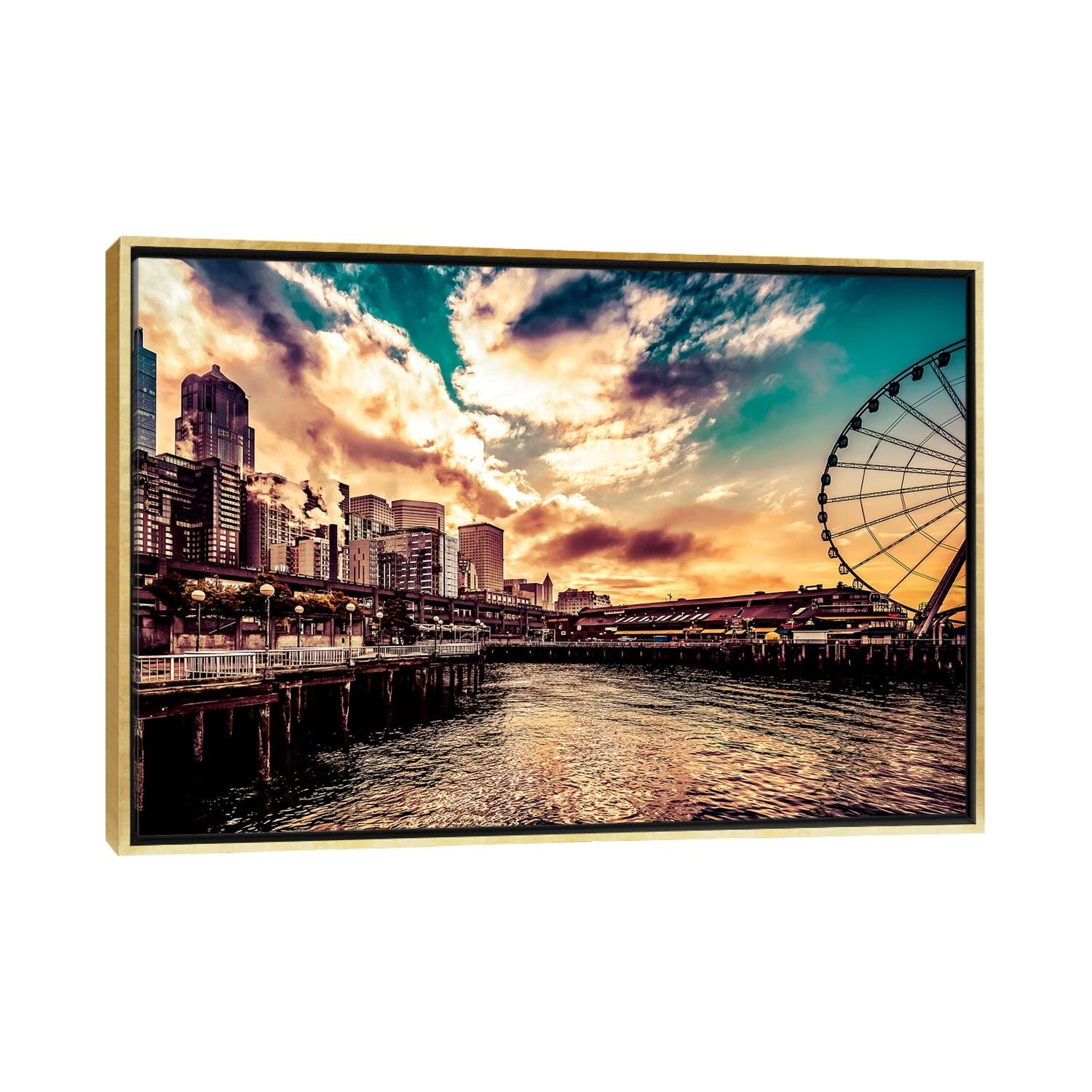iCanvas "Turquoise Seattle Sunrise Great Wheel Pier 57 Cityscape" by Nature Magick Framed