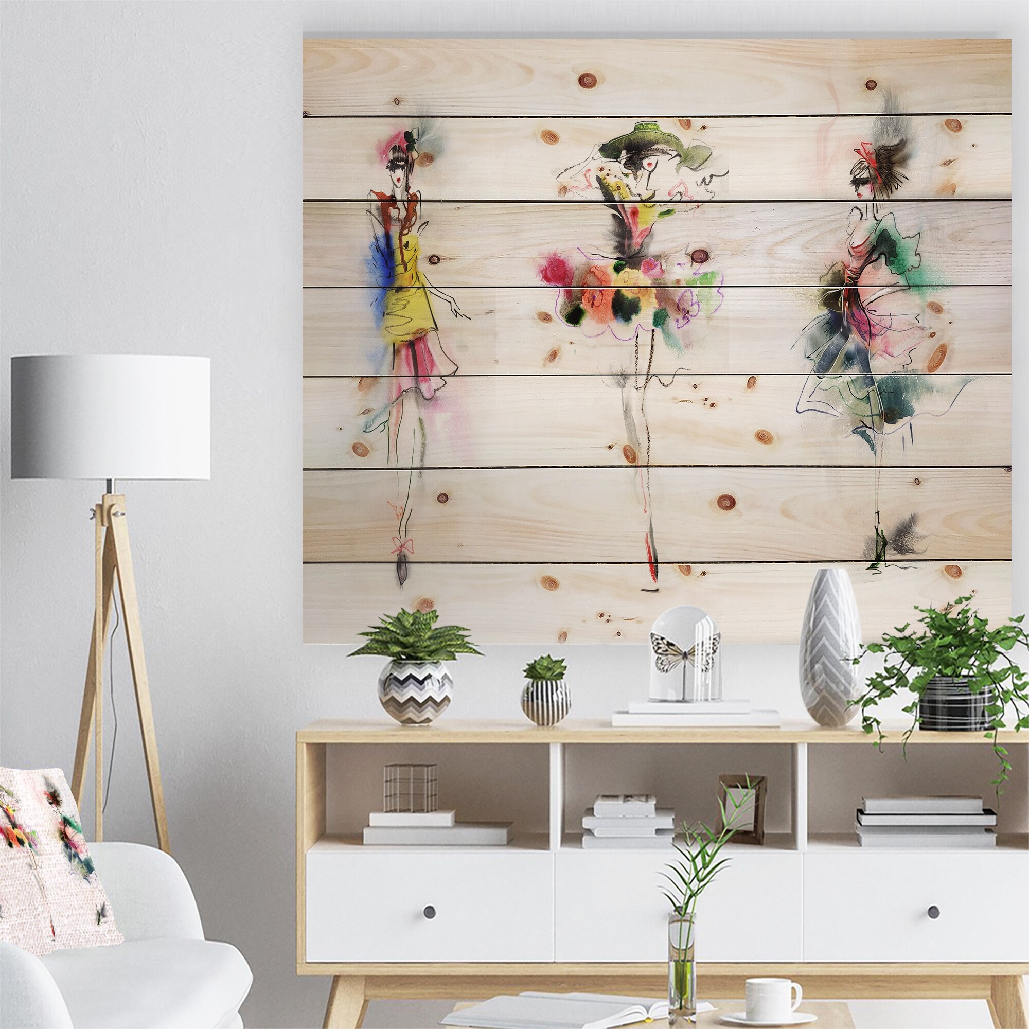 Designart 'Fashion Girls Posing' Fashion Print on Natural Pine Wood - Yellow