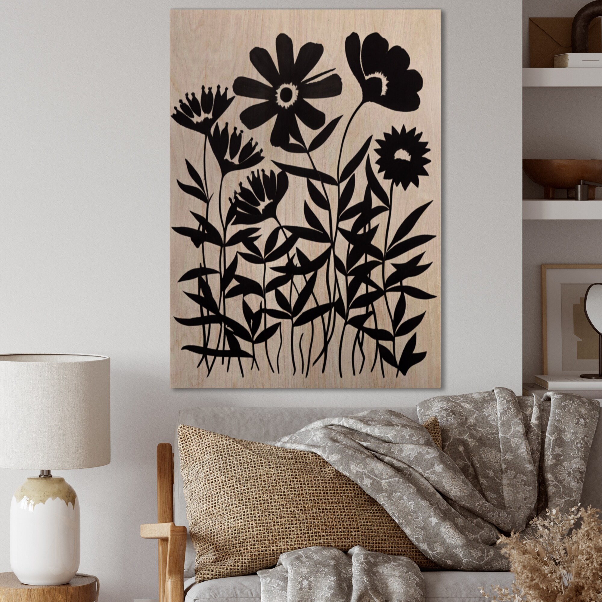 Designart 'Black And White Graphic Flowers VI' Floral Wood Wall Art - Natural Pine Wood
