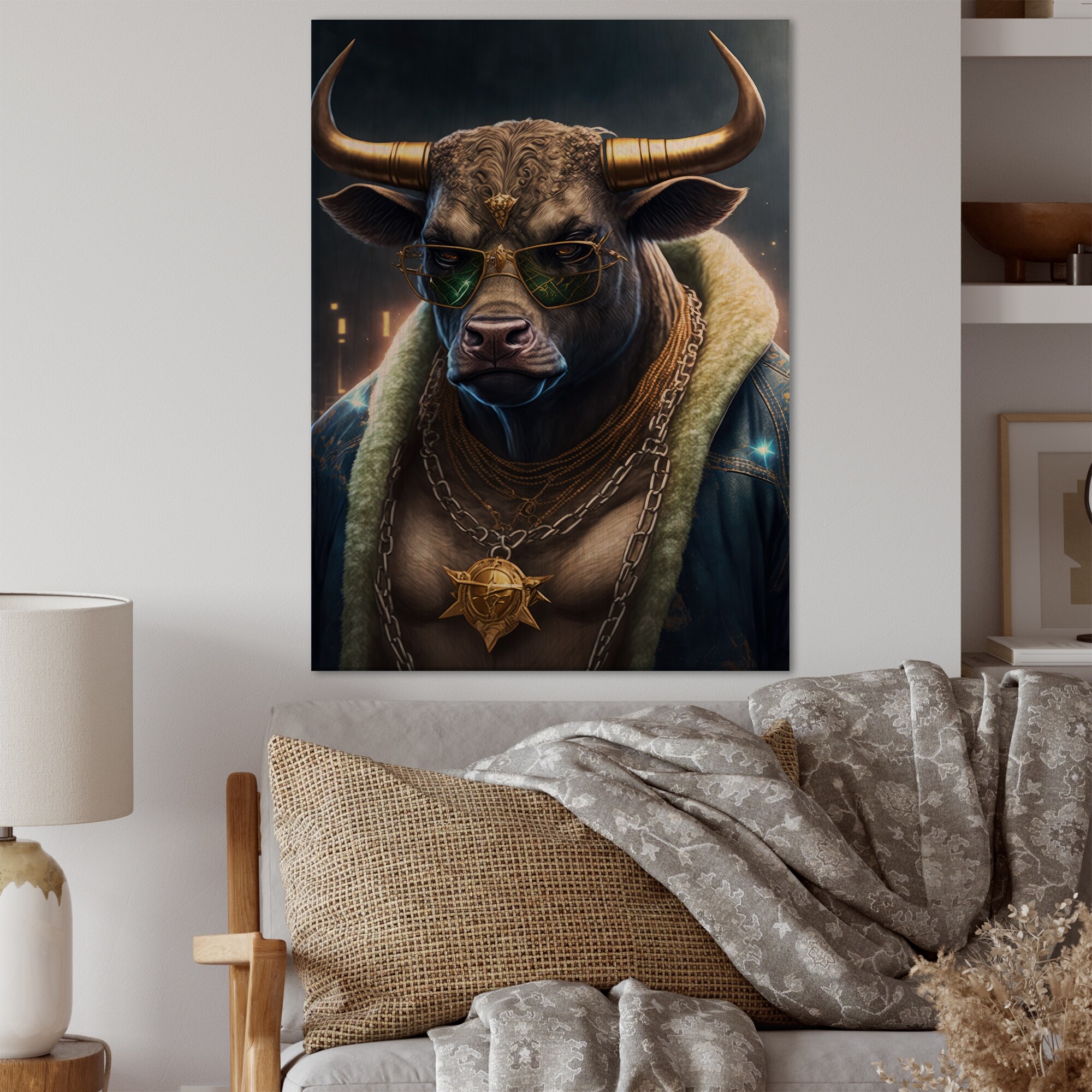 Designart 'Taurus Gangster in NYC I' Animals Taurus Gangster Mafia Wood Wall Art - Natural Pine Wood