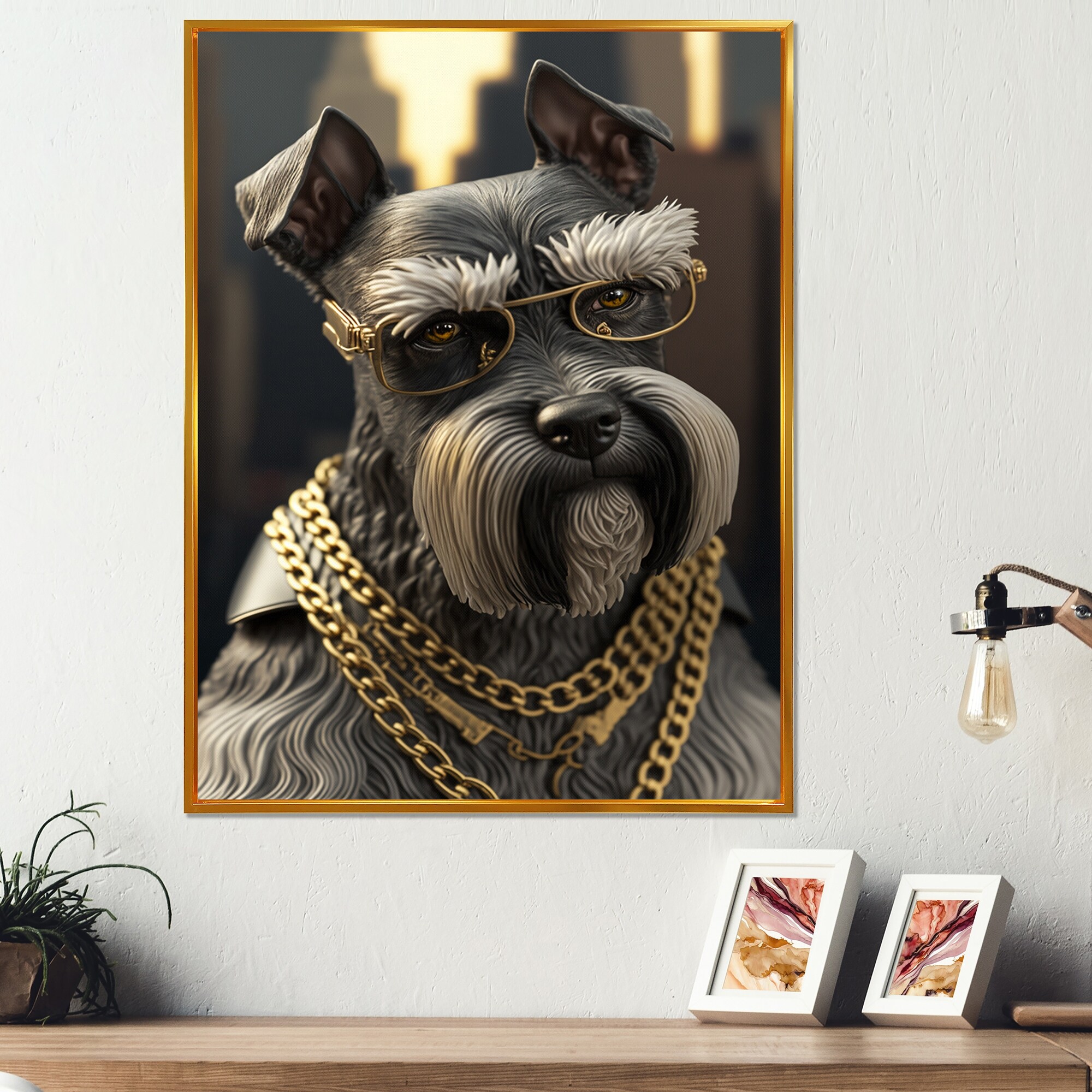 Designart "Schnauzer Gangster in NYC I" Animals Framed Canvas Art Print