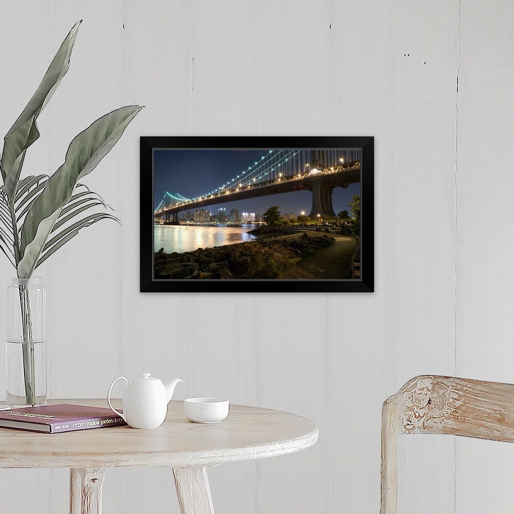 "Night view of the Manhattan Bridge, NYC" Black Framed Print