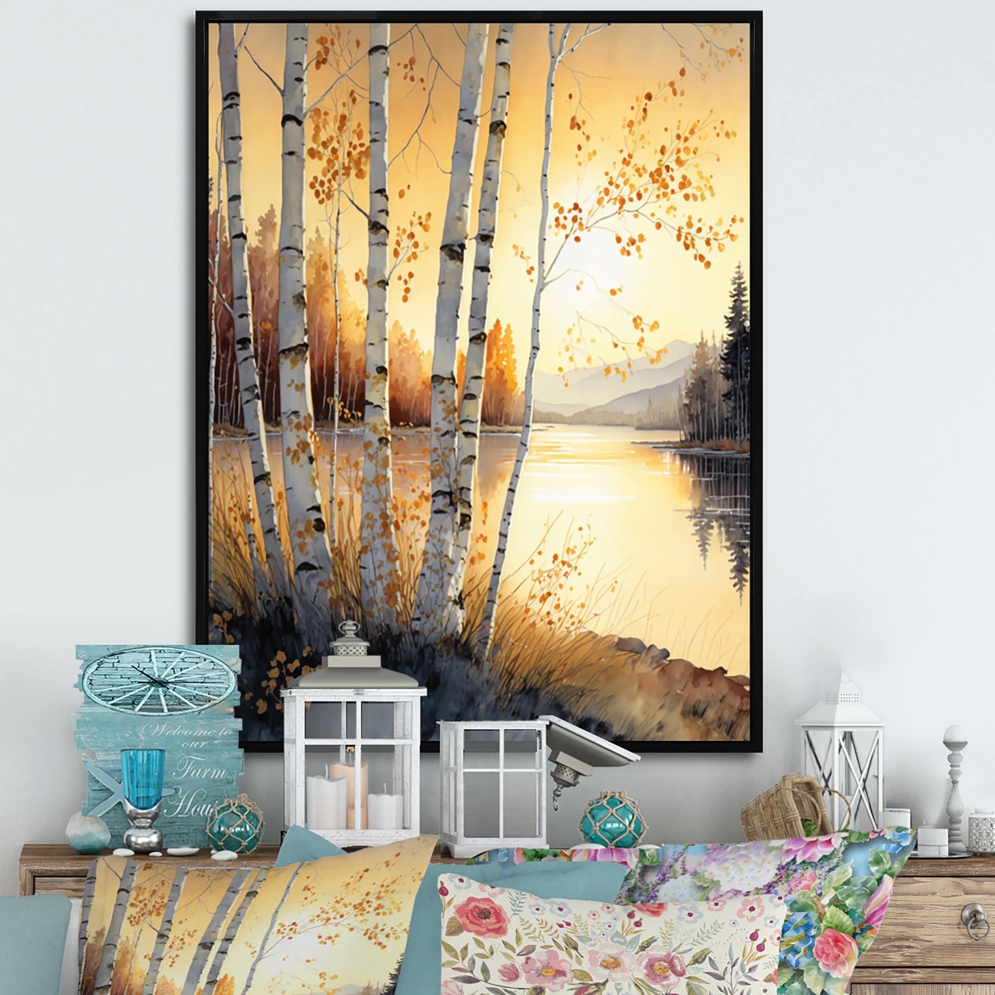 Designart "Yellow Birches By the Lakeside II" Landscape Forest Framed Canvas Wall Art Print