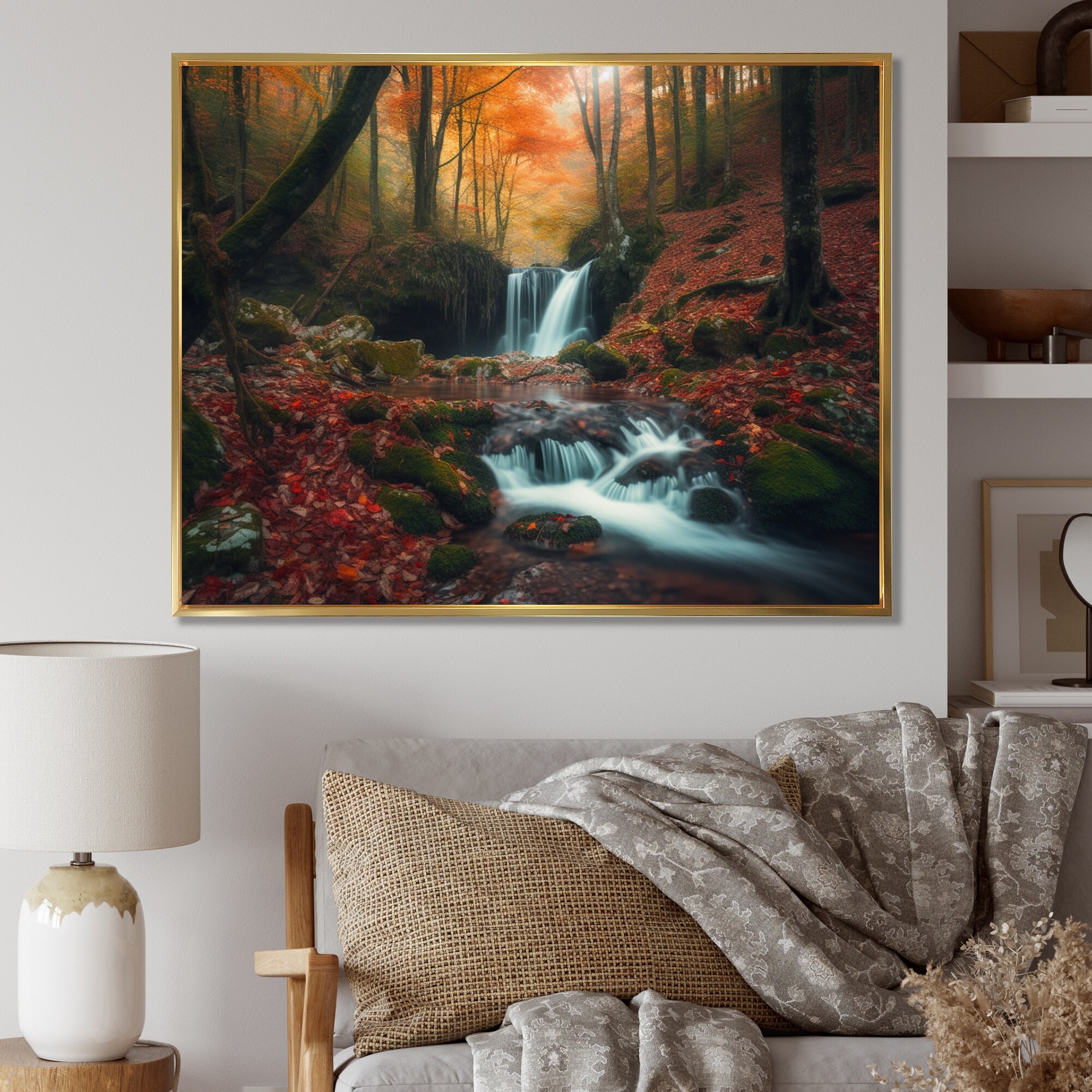 Designart "Waterfall In Autumn I" Landscape Forest Framed Wall Art Prints