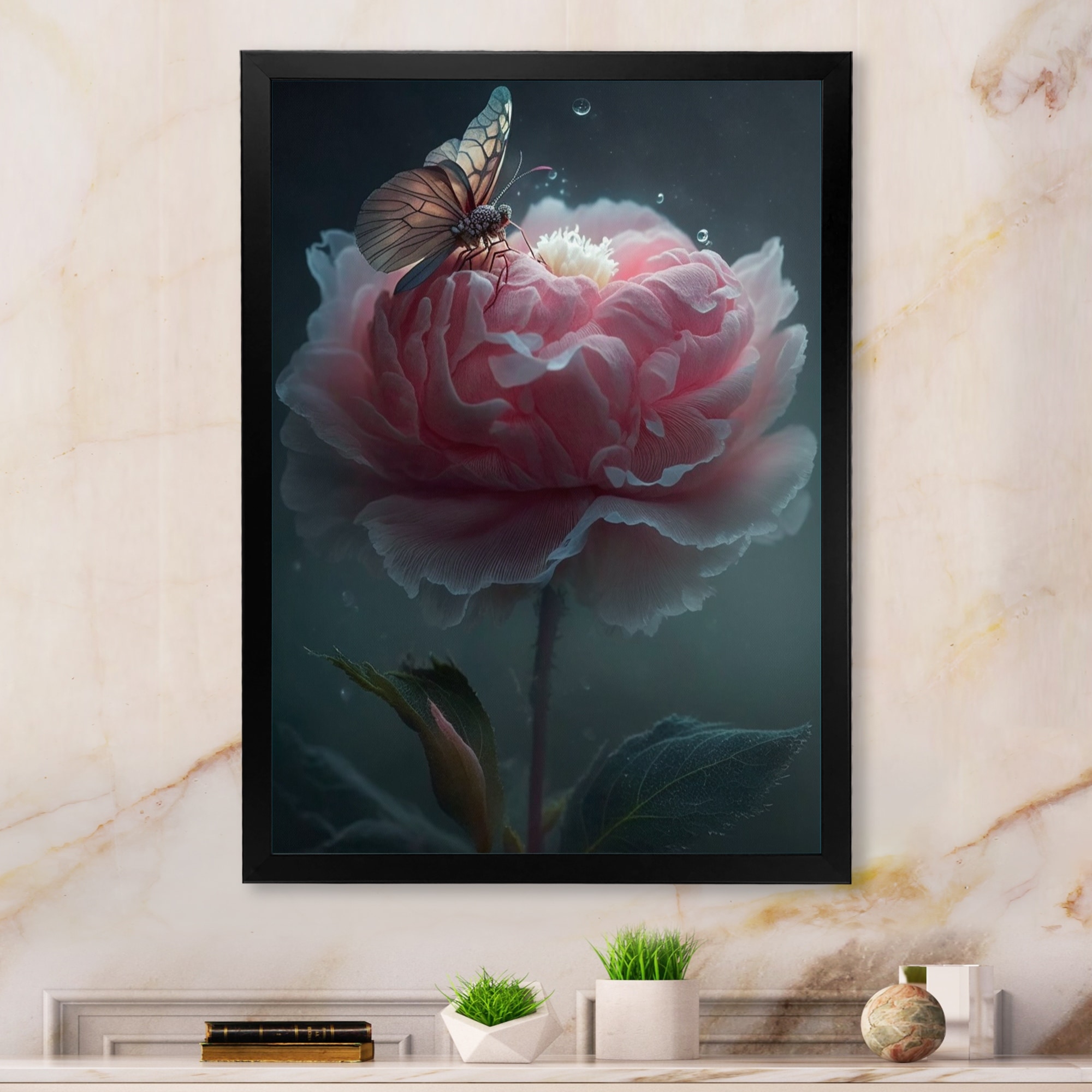 Designart "Pink Flower Blooming Butterflies" Floral Framed Wall Decor