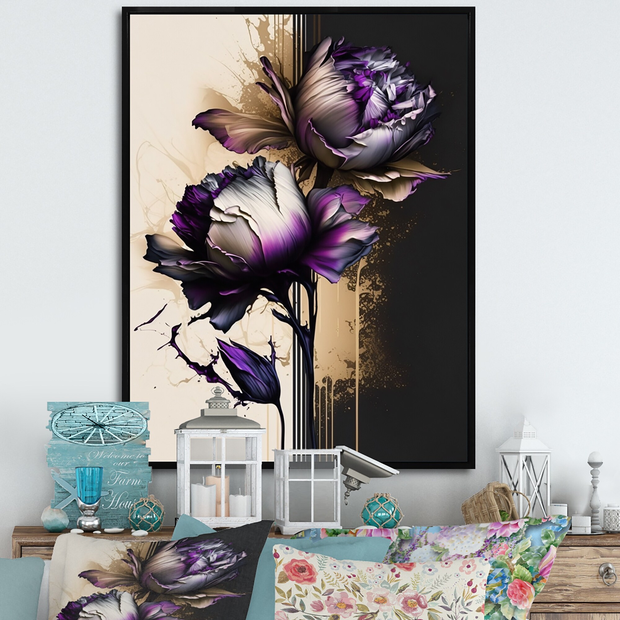 Designart "Puple Peony Flower on Abstract Paint V" Floral & Botanical Framed Canvas Art Print