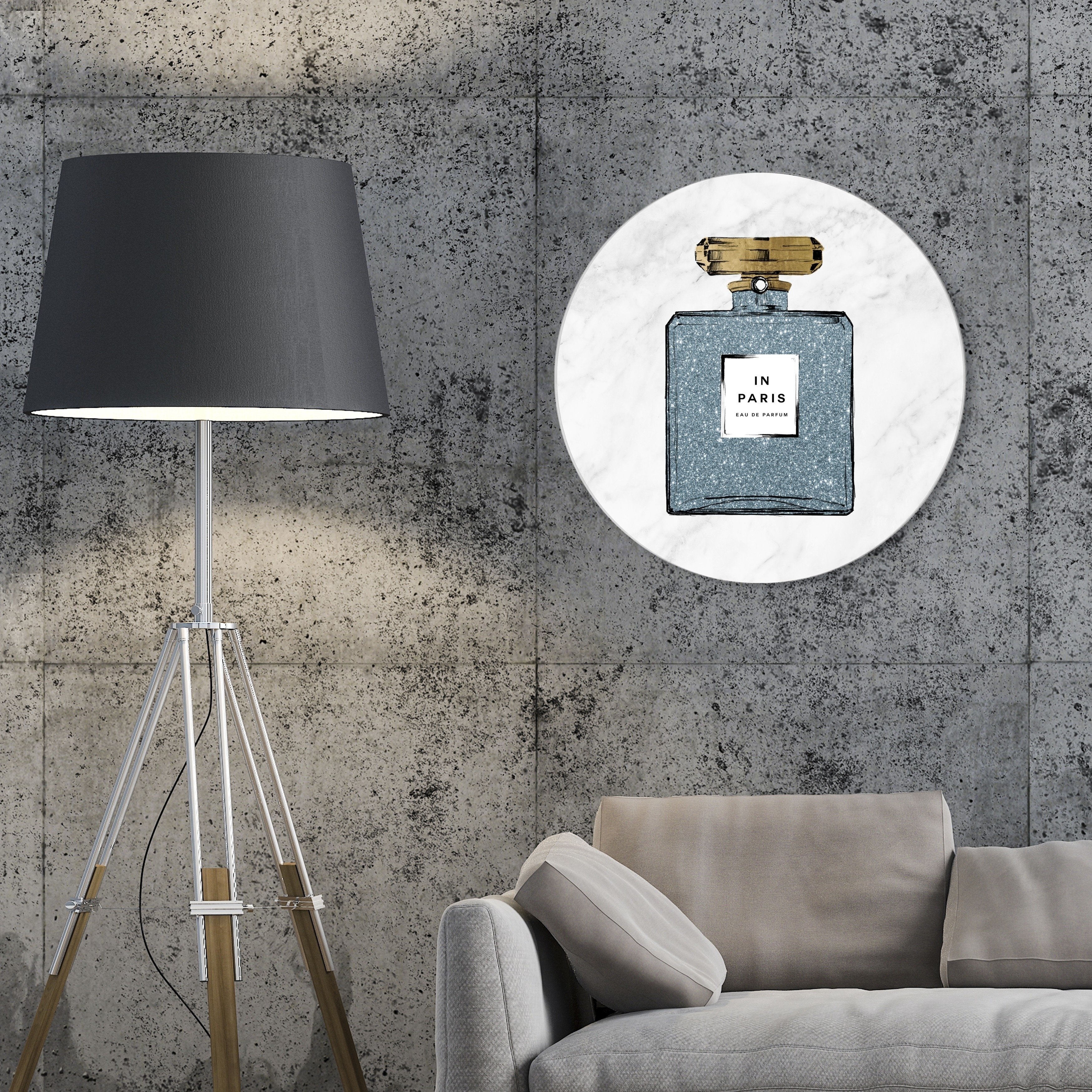Oliver Gal 'Paris Blue Perfume Marble Circle' Fashion and Glam Round Circle Acrylic Wall Art - Blue, Gold
