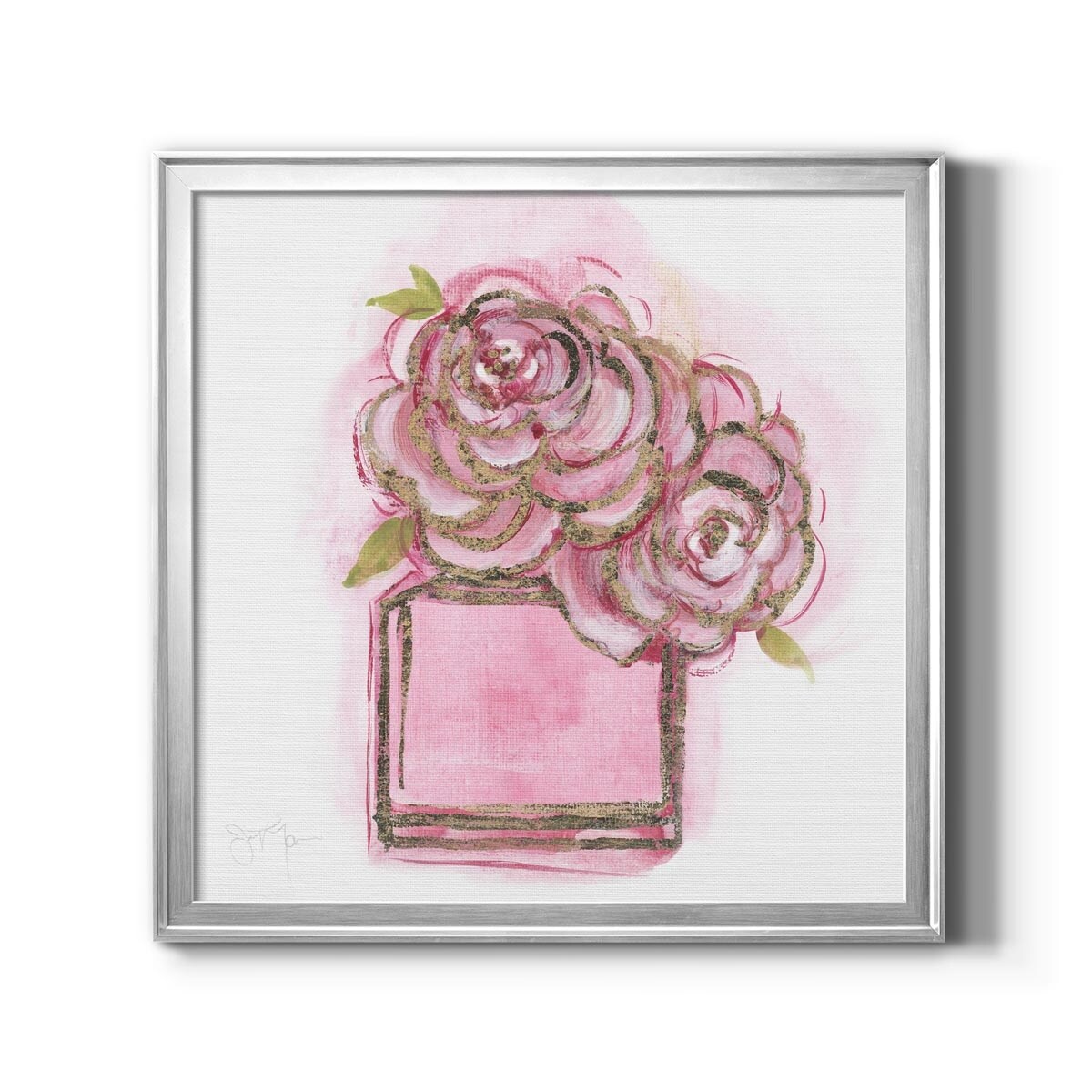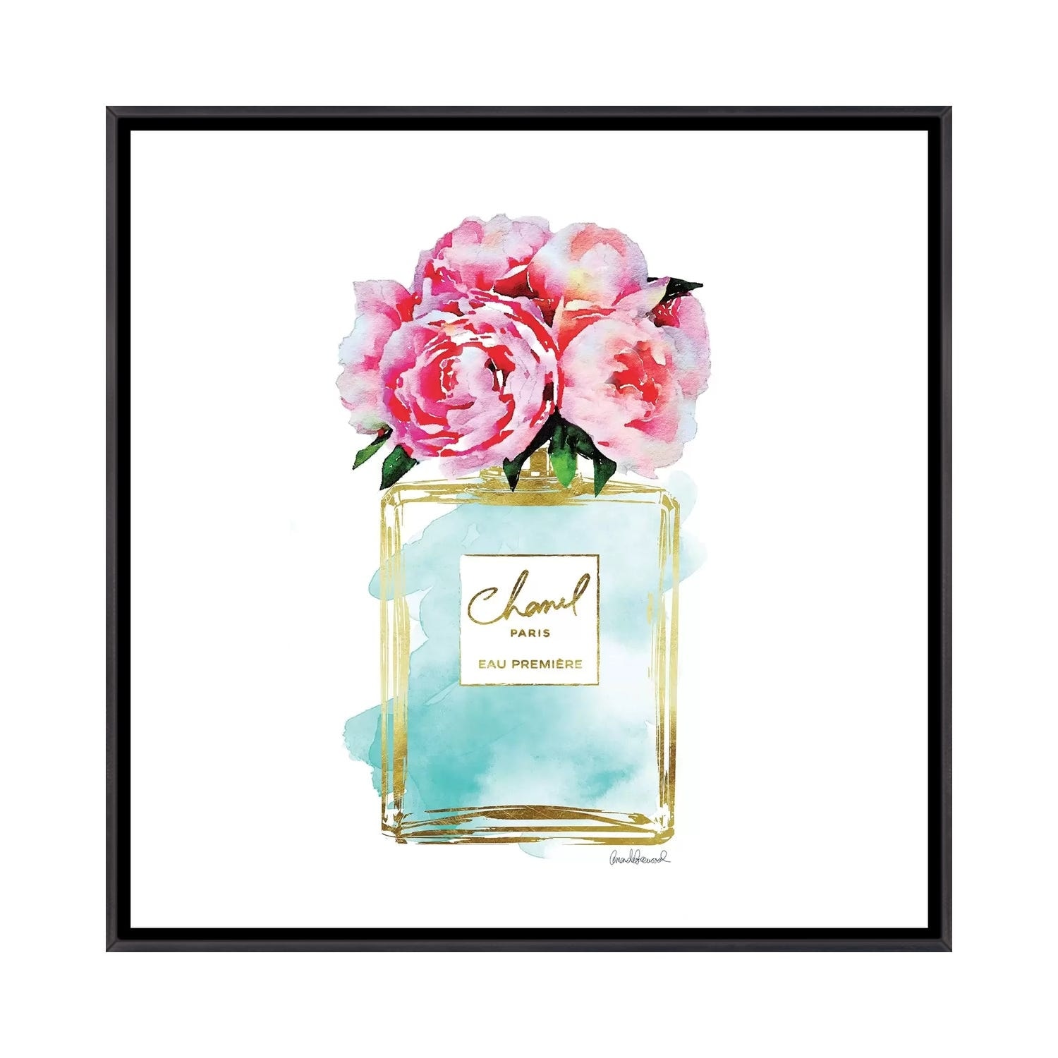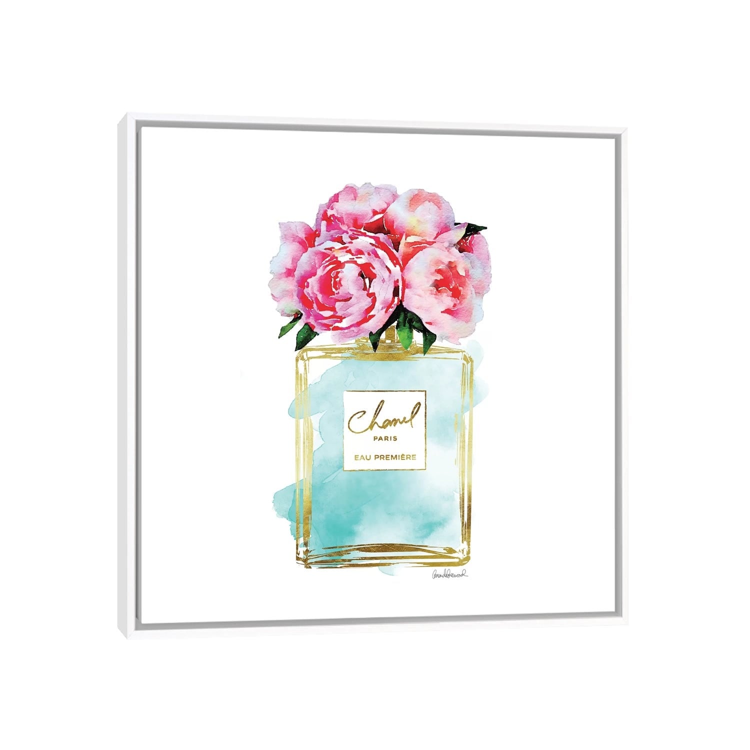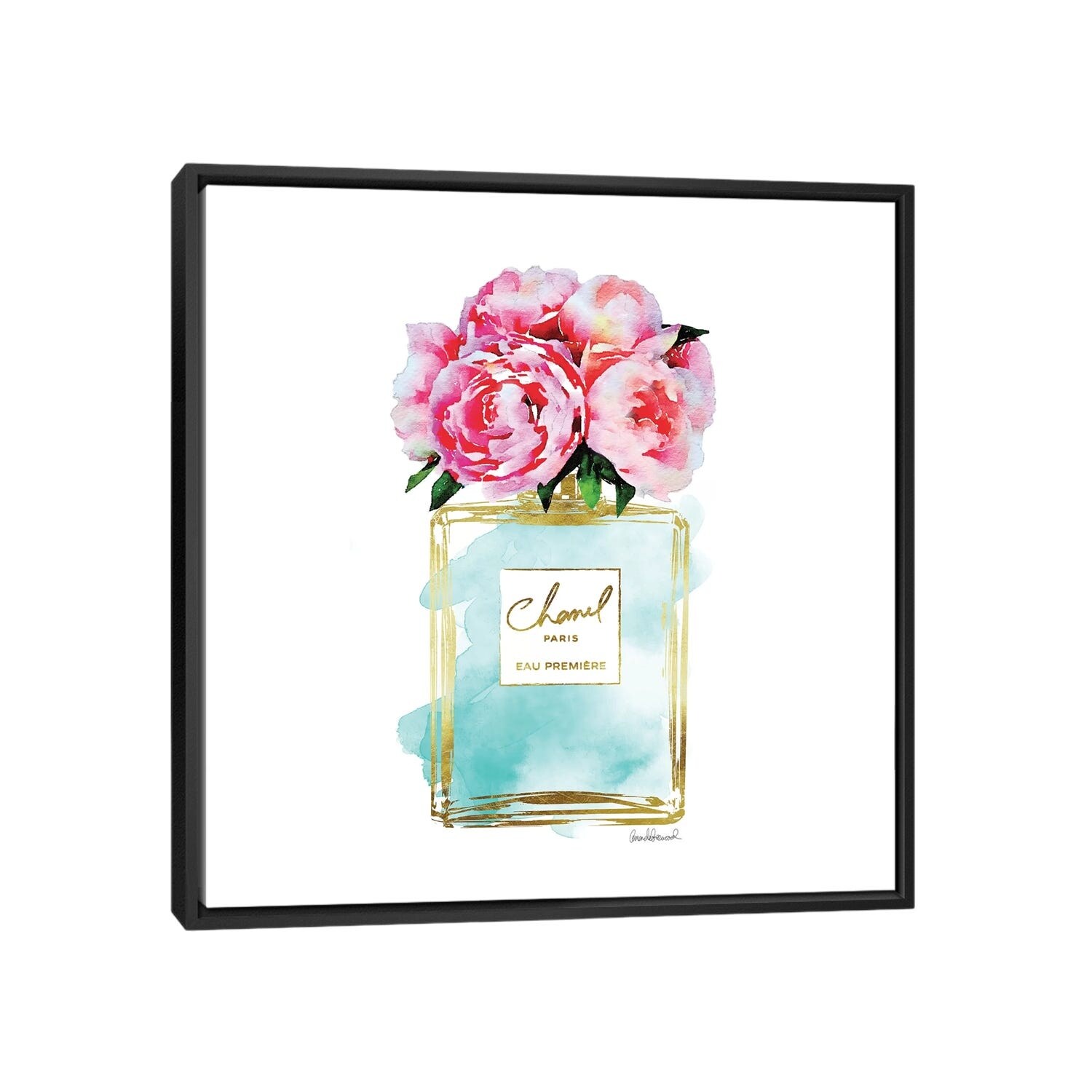 iCanvas "Gold And Teal Perfume Bottle With Pink Peonies" by Amanda Greenwood Framed