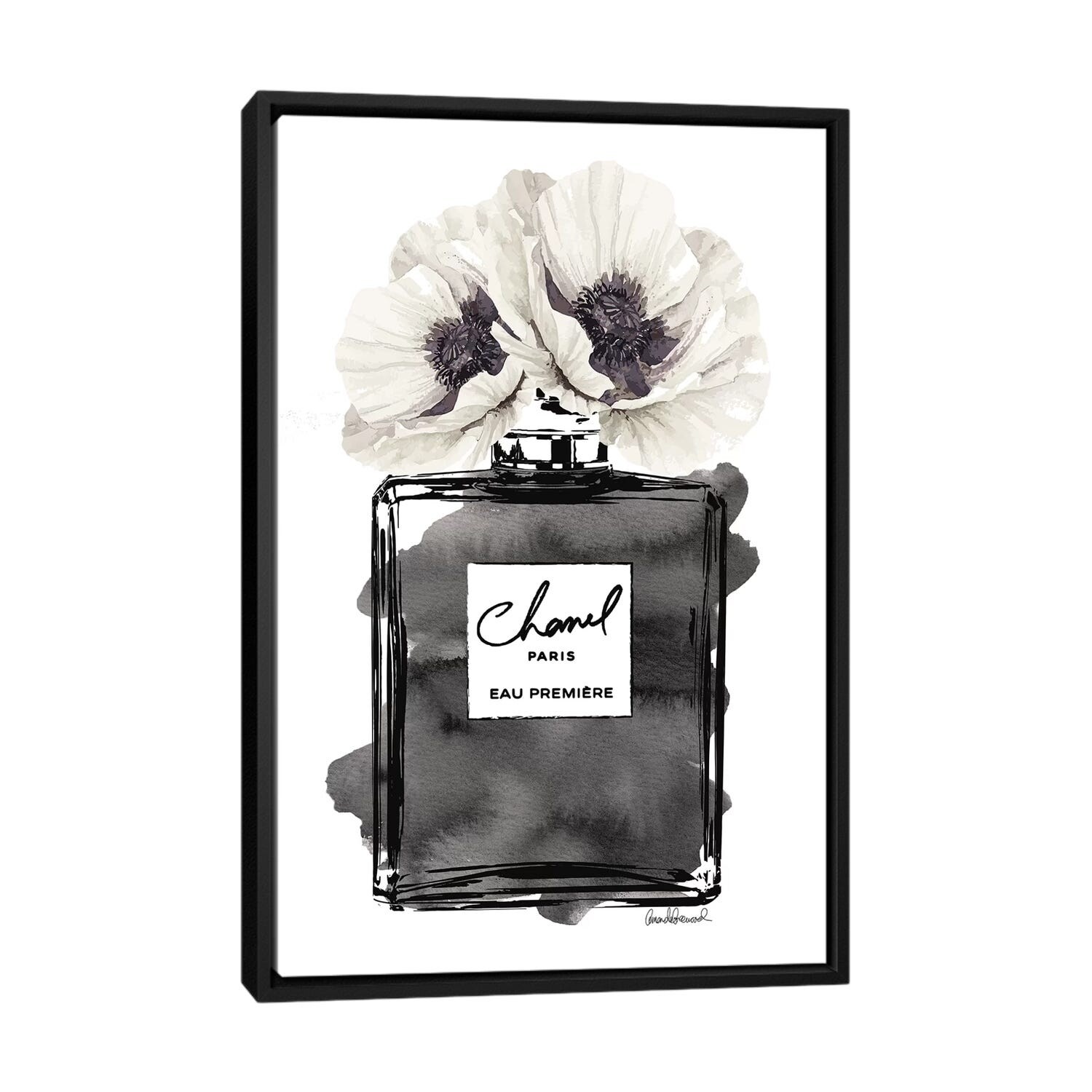 iCanvas "Perfume Bottle, Black With Grey & White Poppy" by Amanda Greenwood Framed Canvas Print