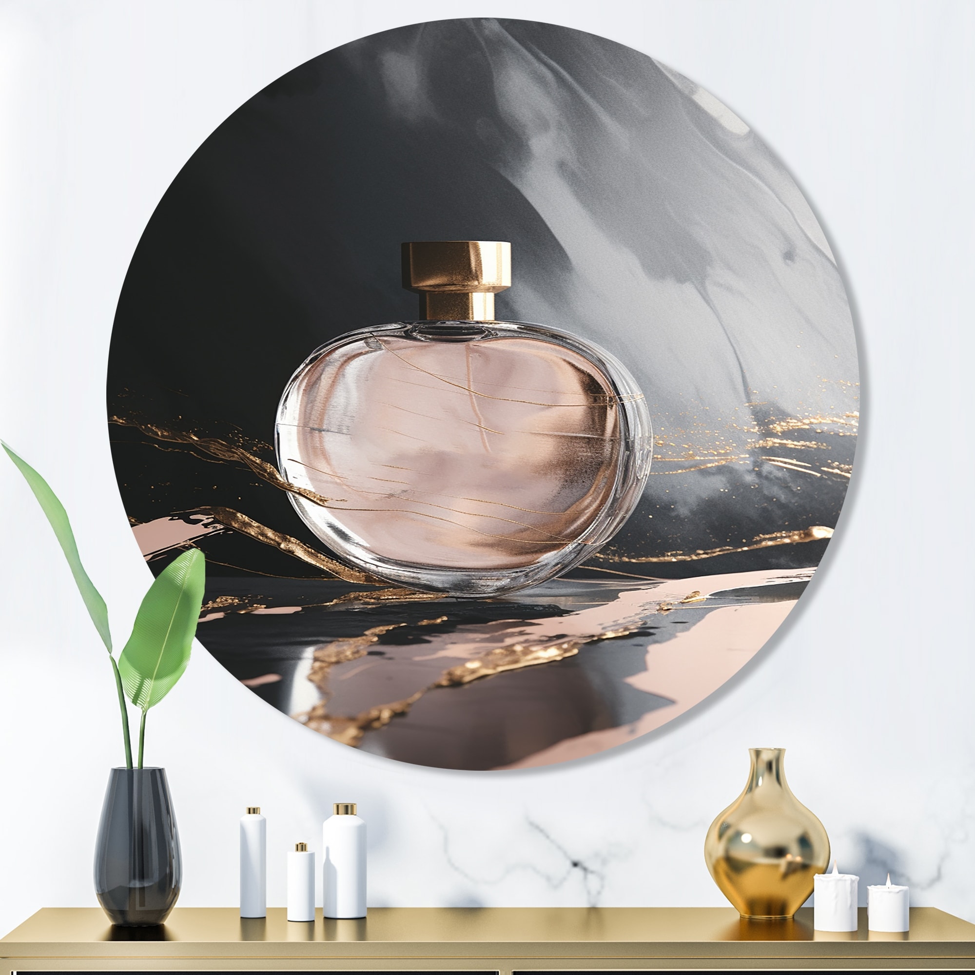 Designart "Gold Perfume Couture I" Fashion Perfume Metal Round Wall Art
