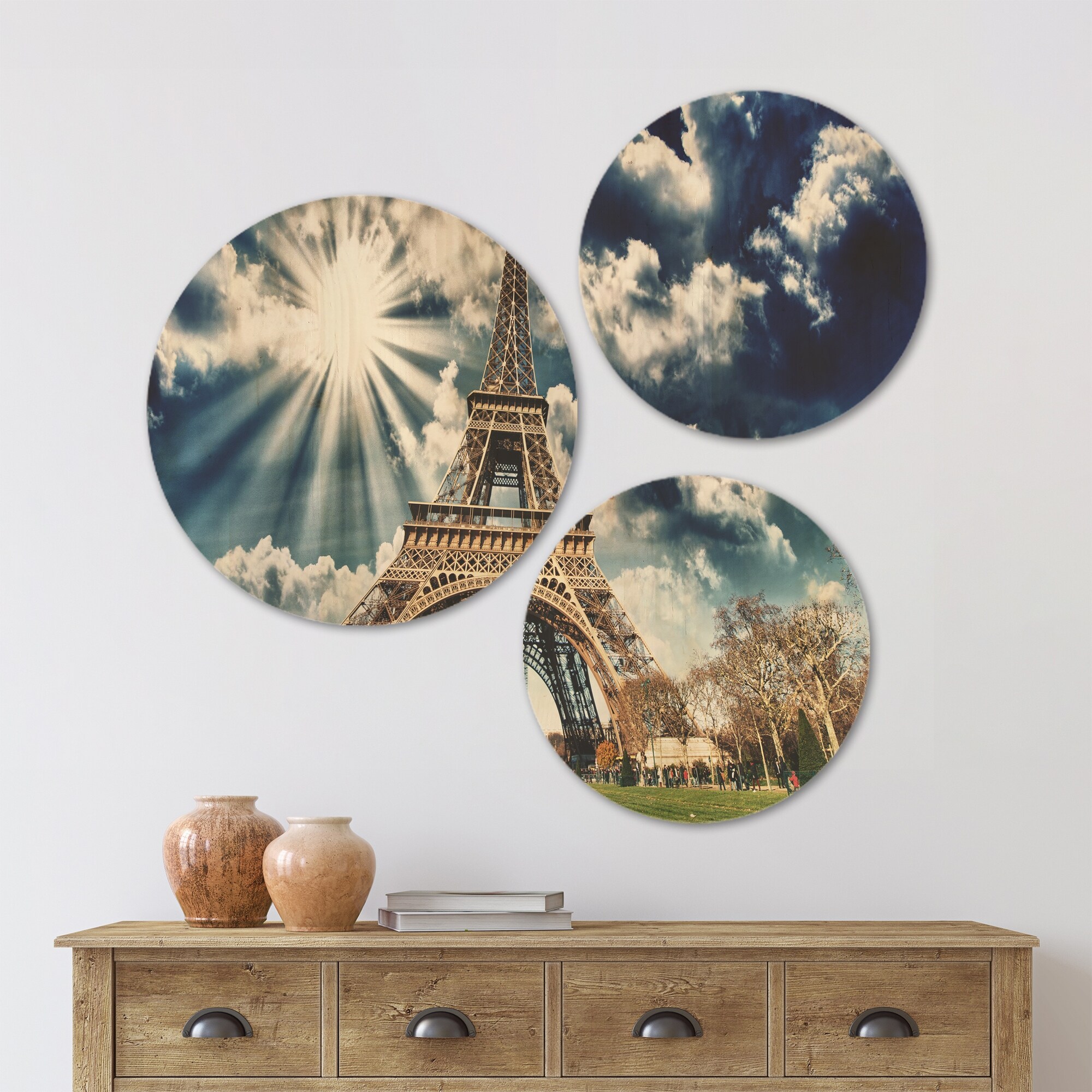 Designart 'Magnificent Paris Eiffel TowerView' Skyline Photography Wood Wall Art Set of 3 Circles