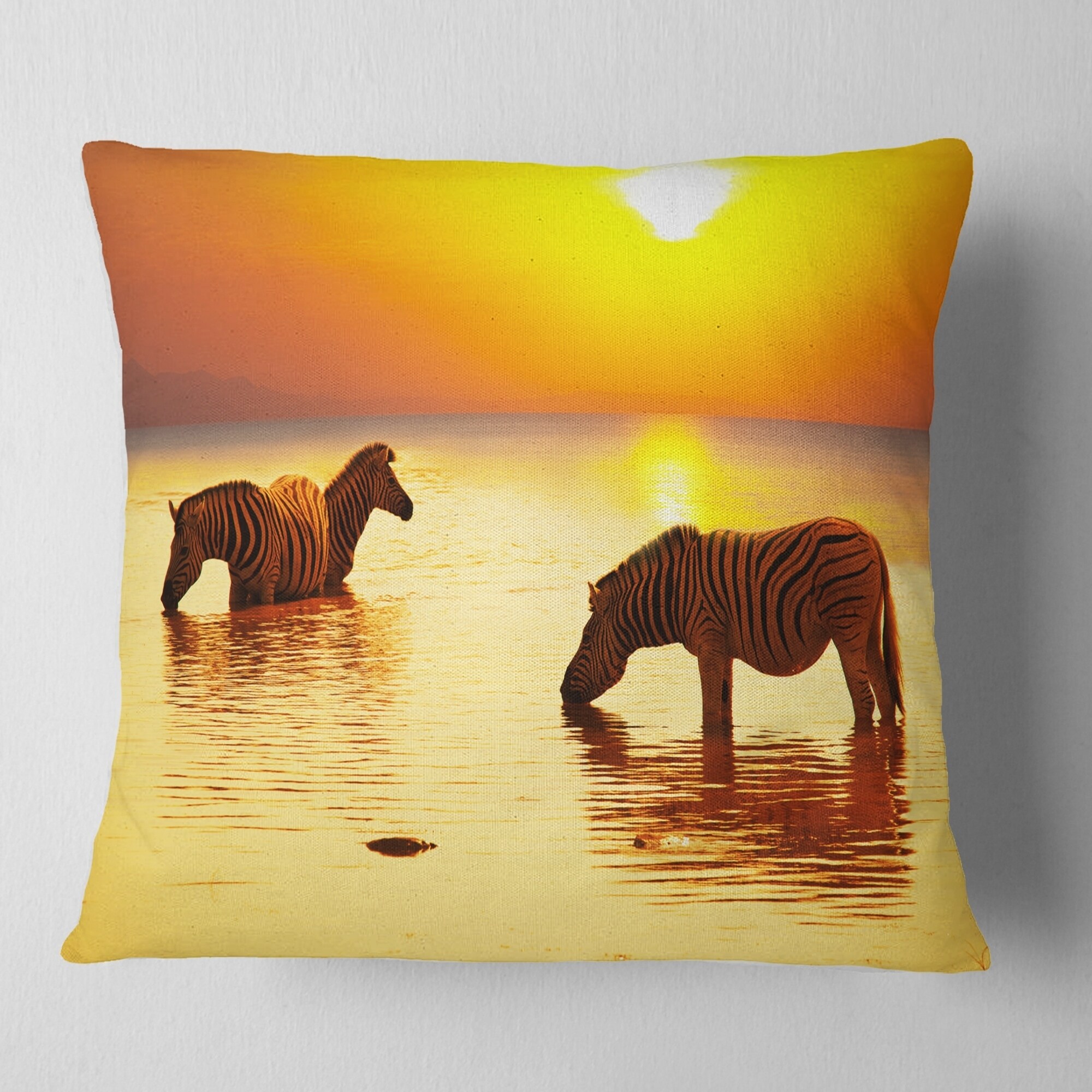 Designart 'Zebras Drinking in Lake at Sunset' Animals Throw Pillow