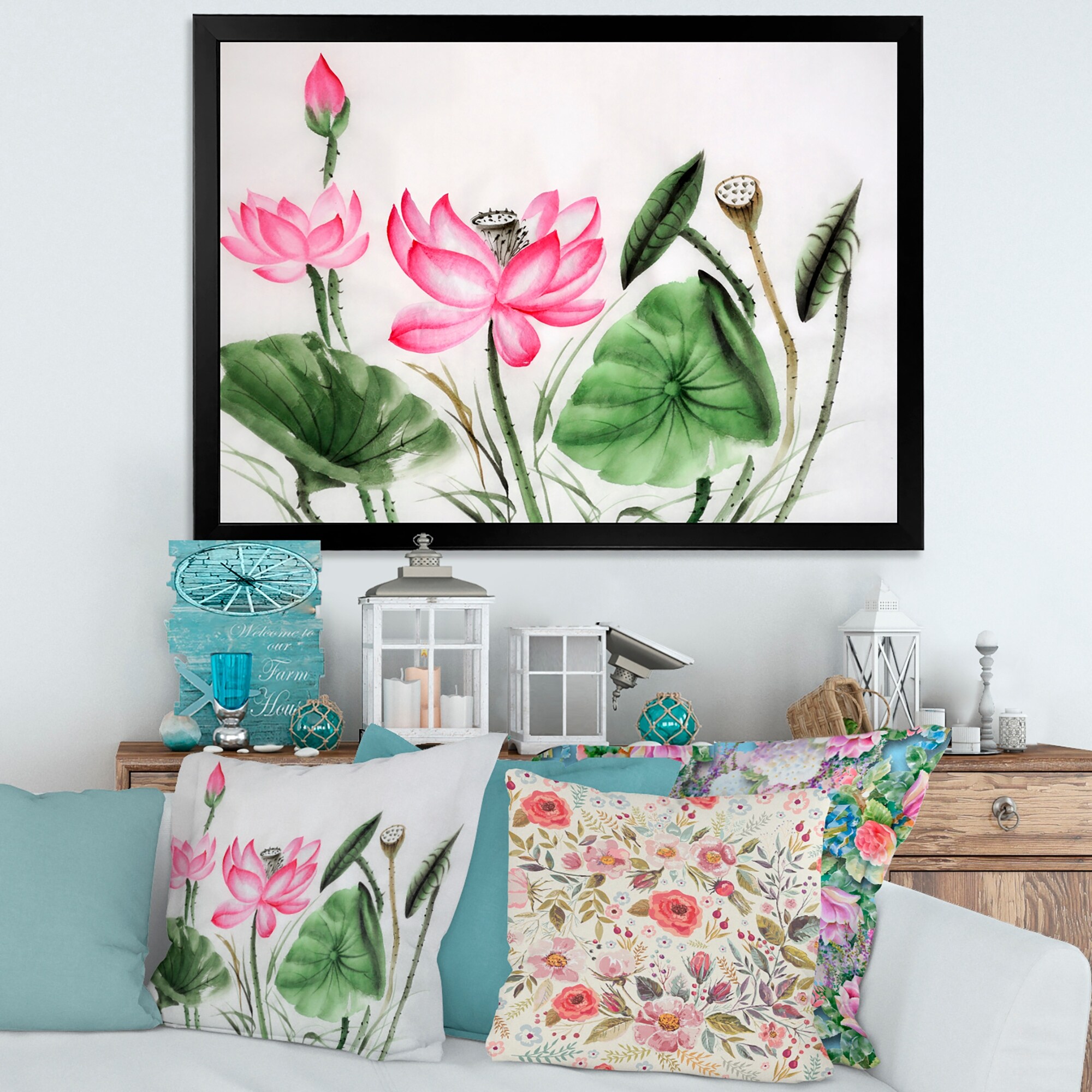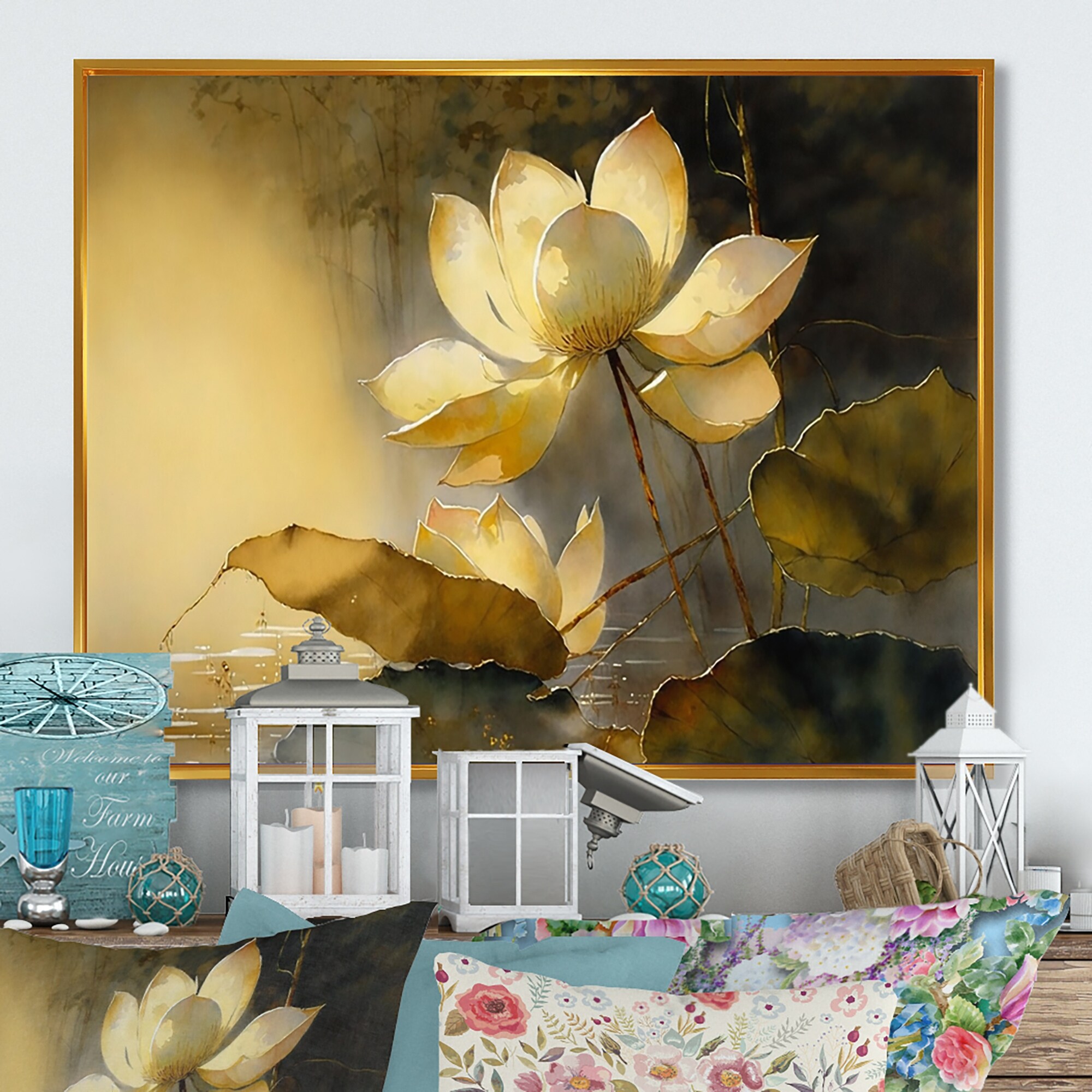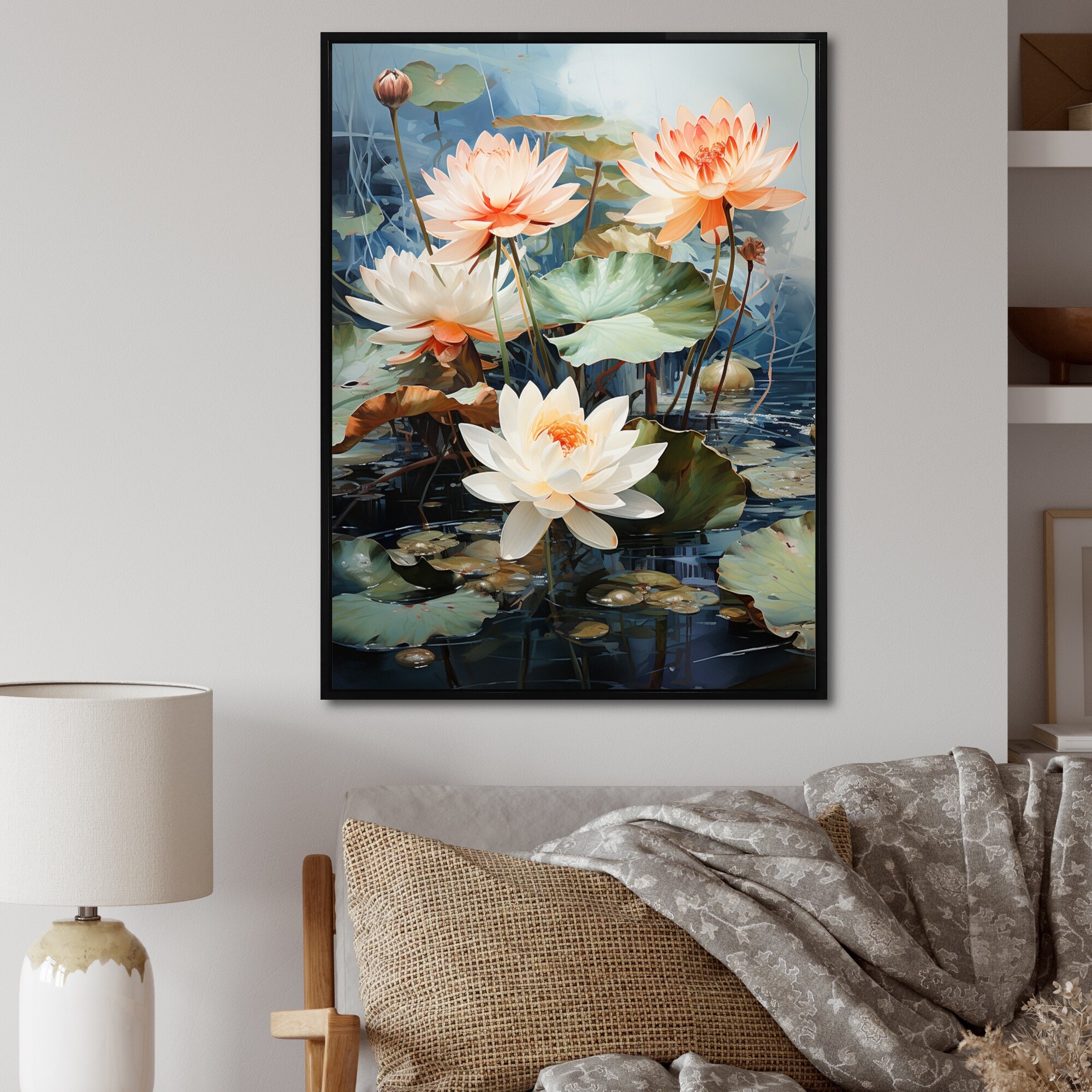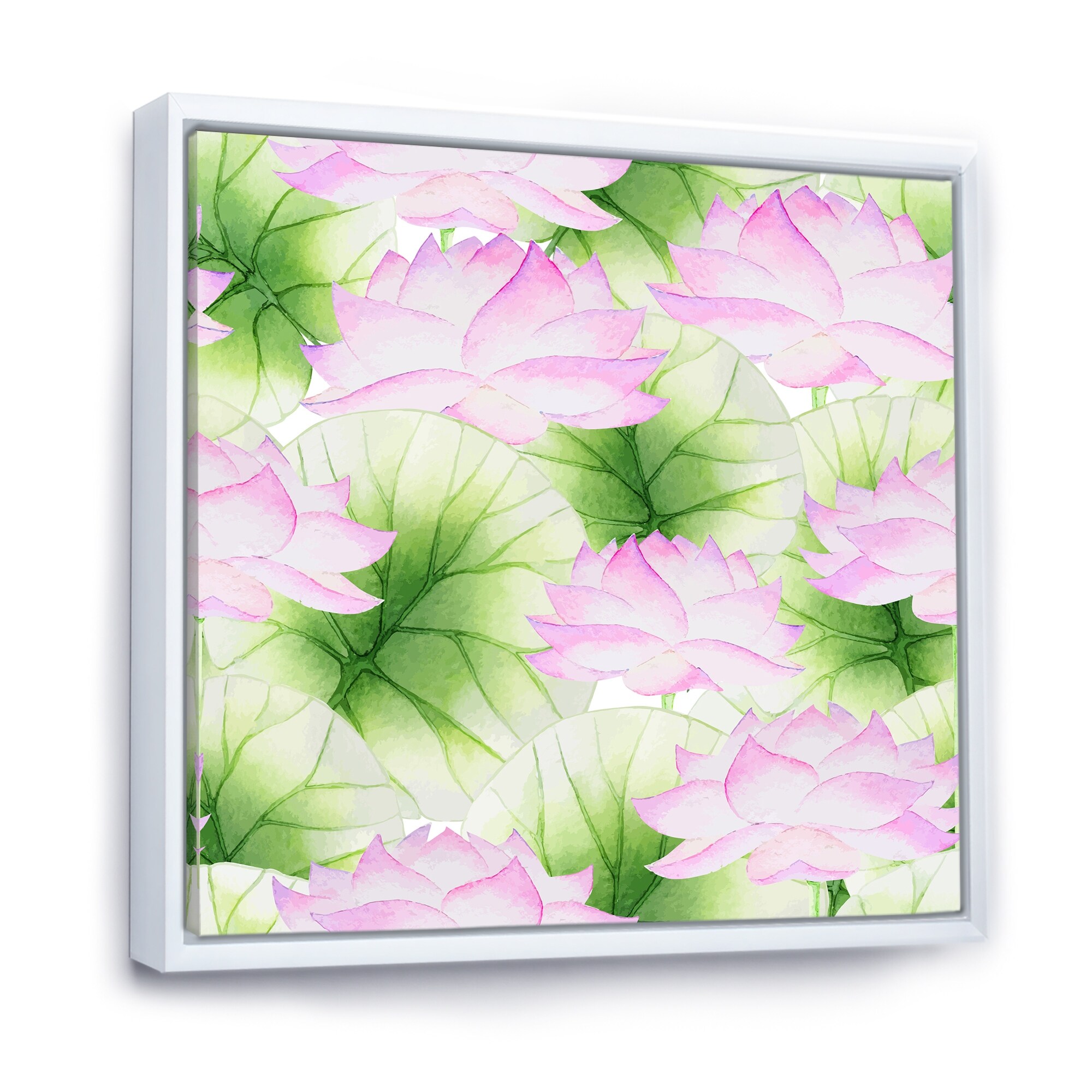 Designart "Blooming Vintage Lotus in the Pond III" Floral Lotus Framed Canvas Wall Art Print