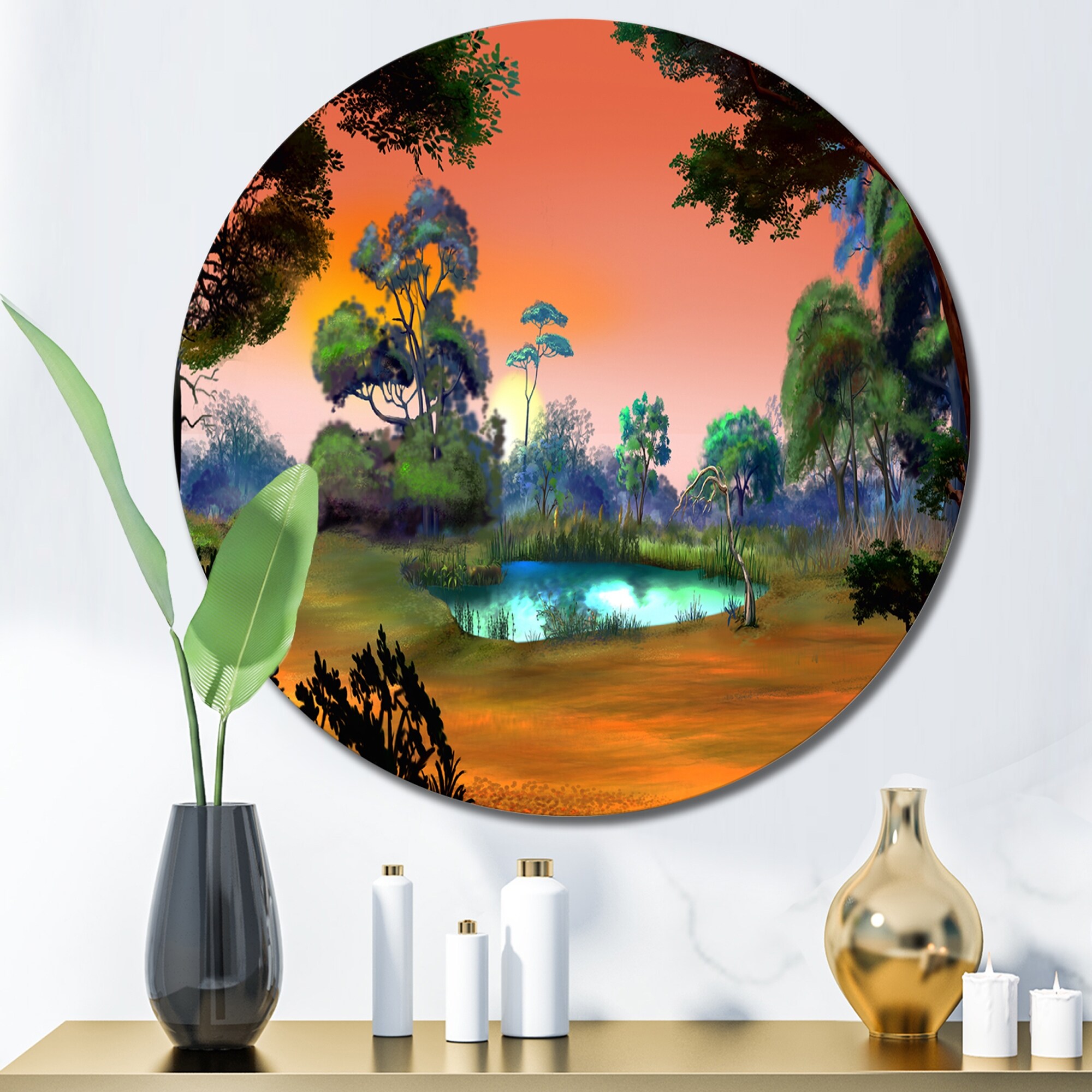 Designart 'Small Pond on A Forest Glade At Dawn' Lake House Metal Circle Wall Art