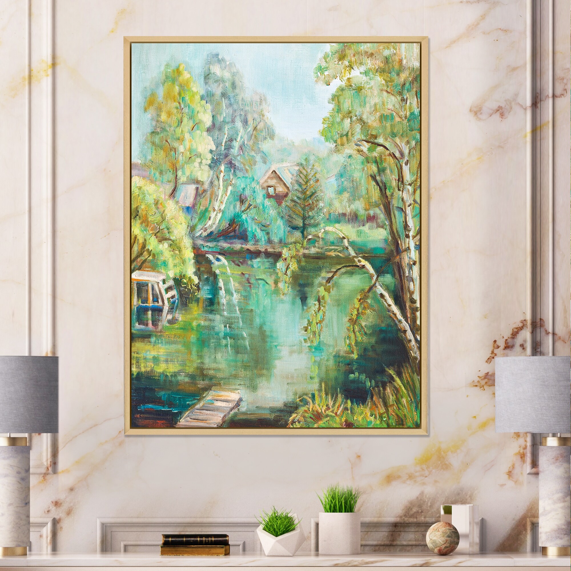 Designart "Green Pond in Summer" Country Framed Canvas Wall Art Print
