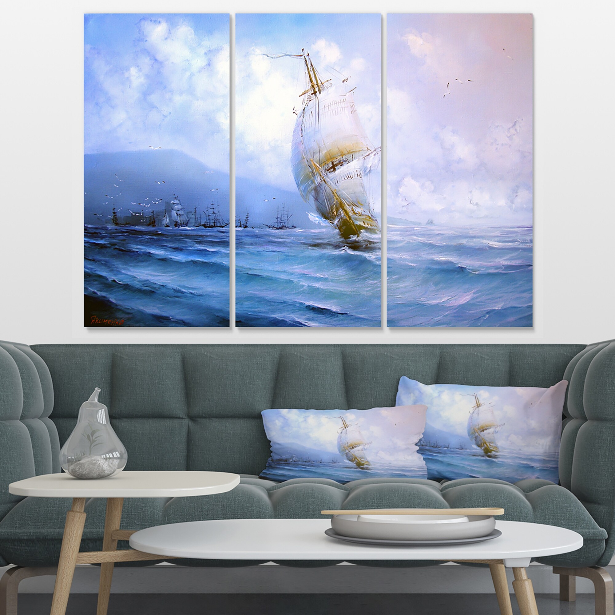 Designart "Vessel in Blue Sea" Seascape Canvas Art Print - 36x28 - 3 Panels