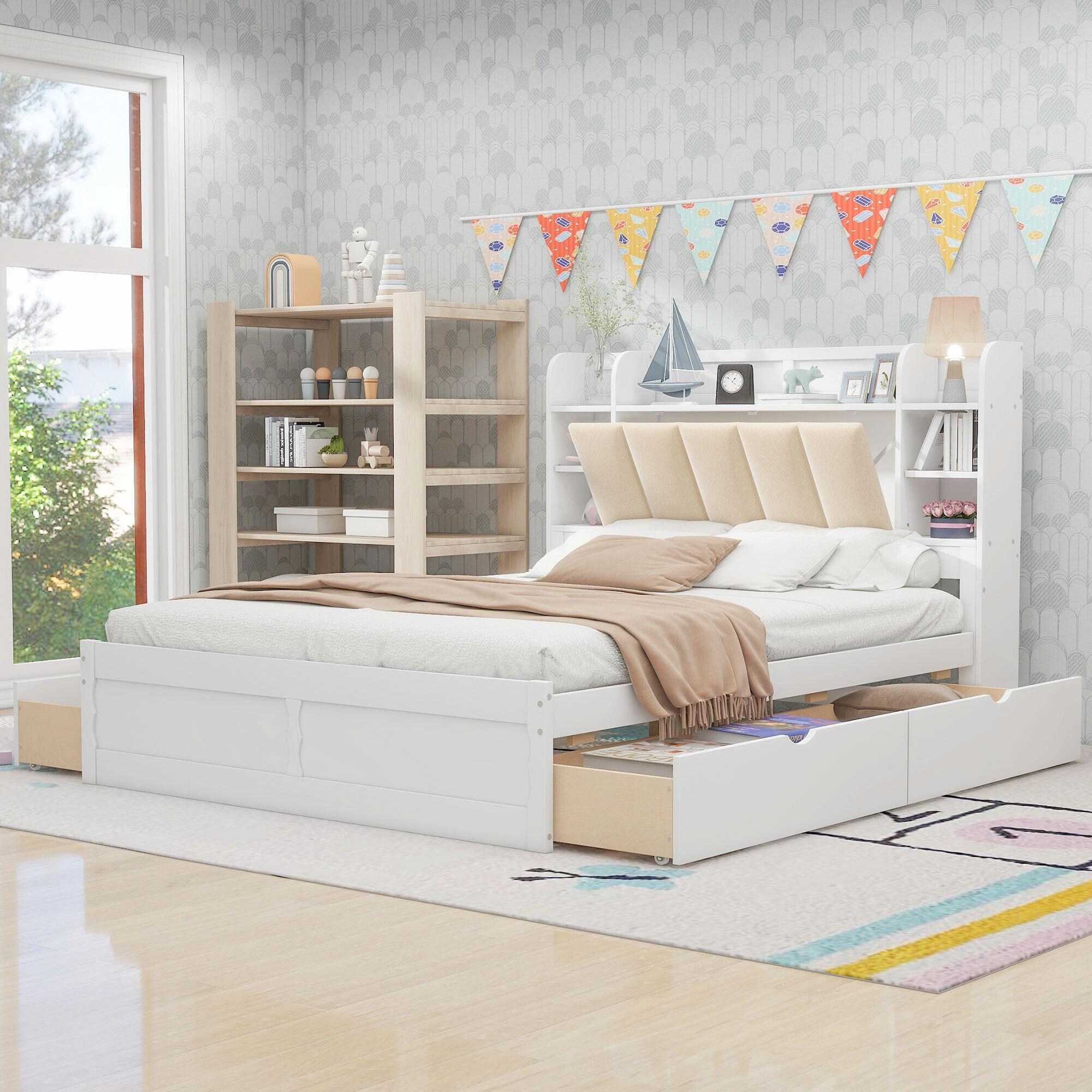 Solid & Sturdy Queen Size Upholstered Platform Bed with Shelves and 4 Drawers