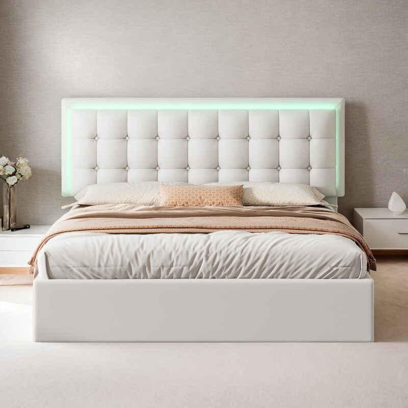 Queen Faux Leather Platform Bed with LED Headboard & Hydraulic Storage