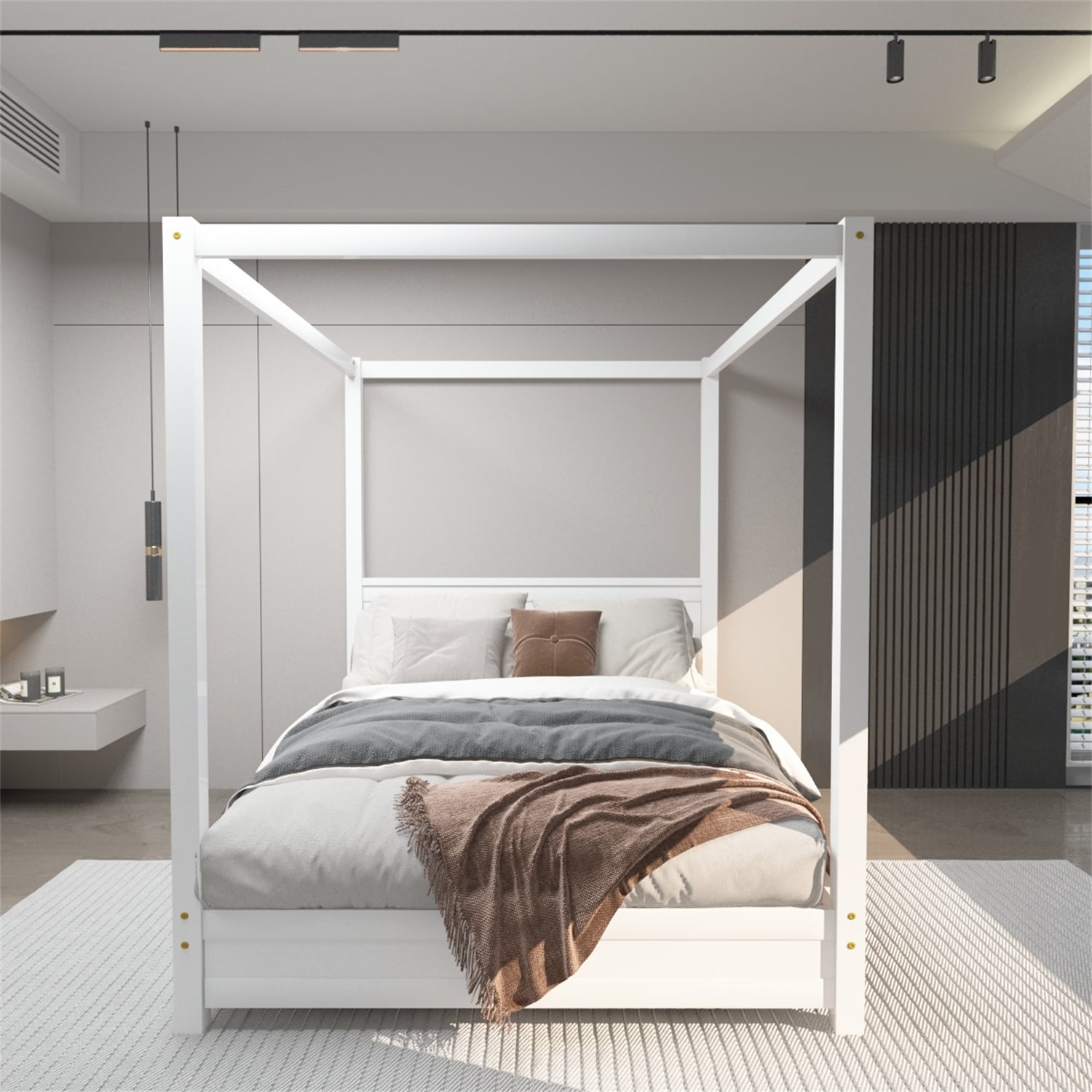 Queen Size Canopy Platform Bed with Twin Size Trundle and 3 Drawers