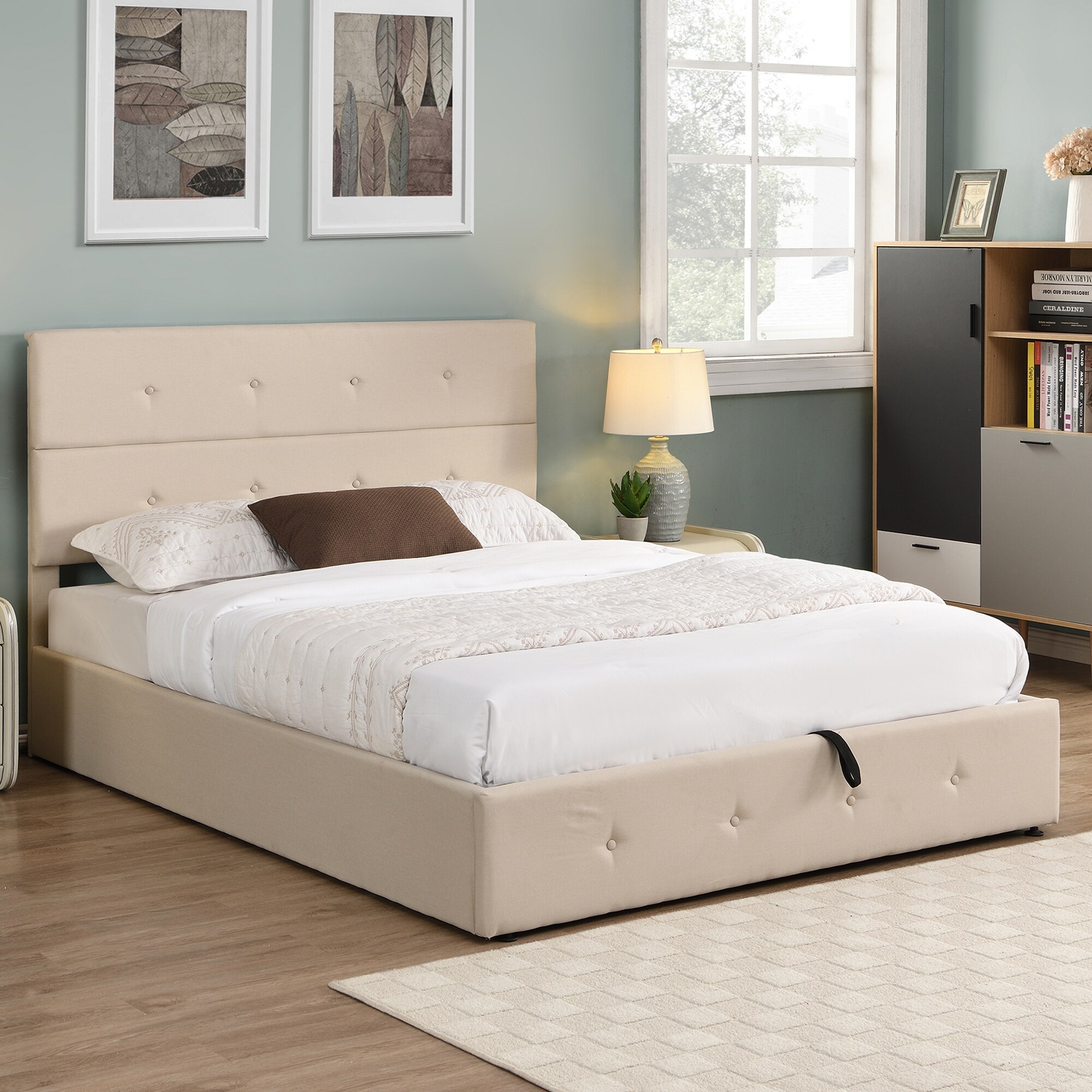 Queen Size Hydraulic Storage System Platform Bed with Tufted Upholstery for Small Bedroom City Aprtment Dorm