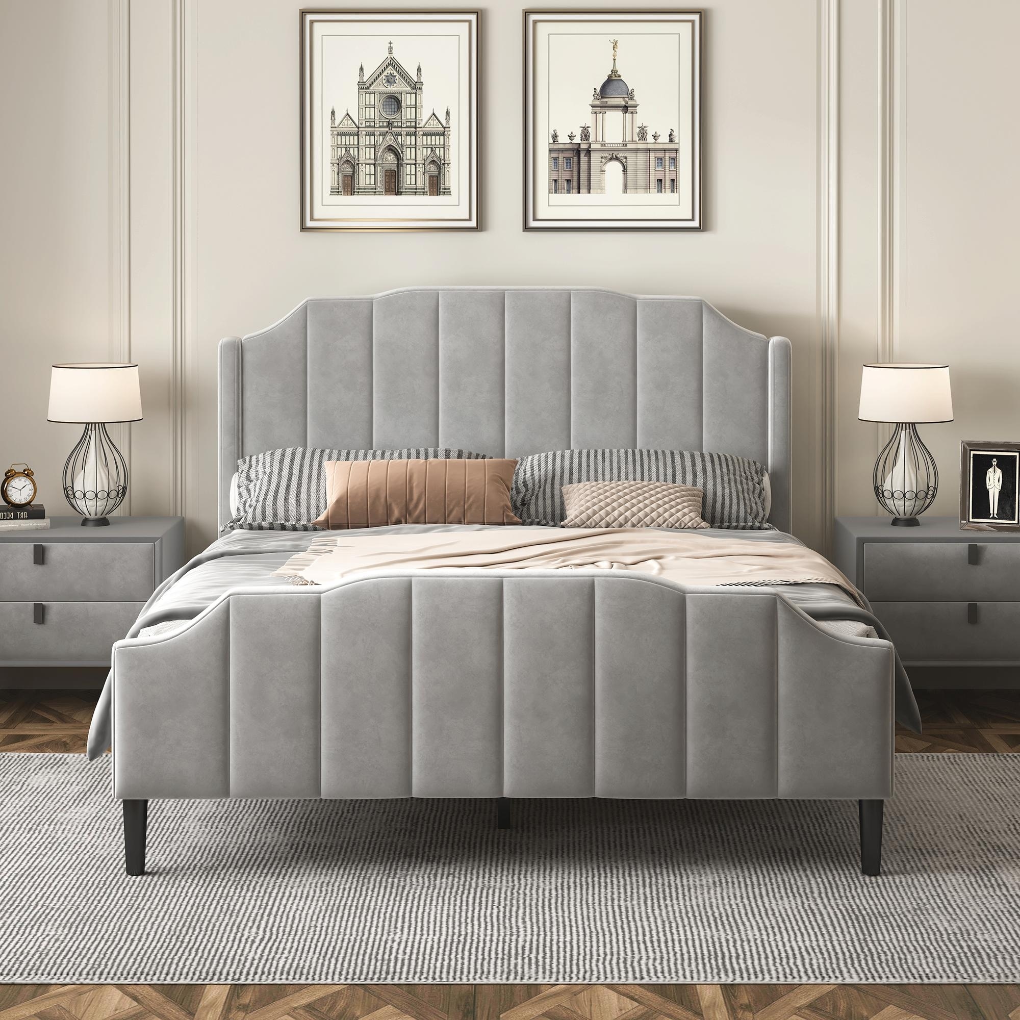 Velvet Upholstered Queen Platform Bed with Wingback Headboard & Drawer