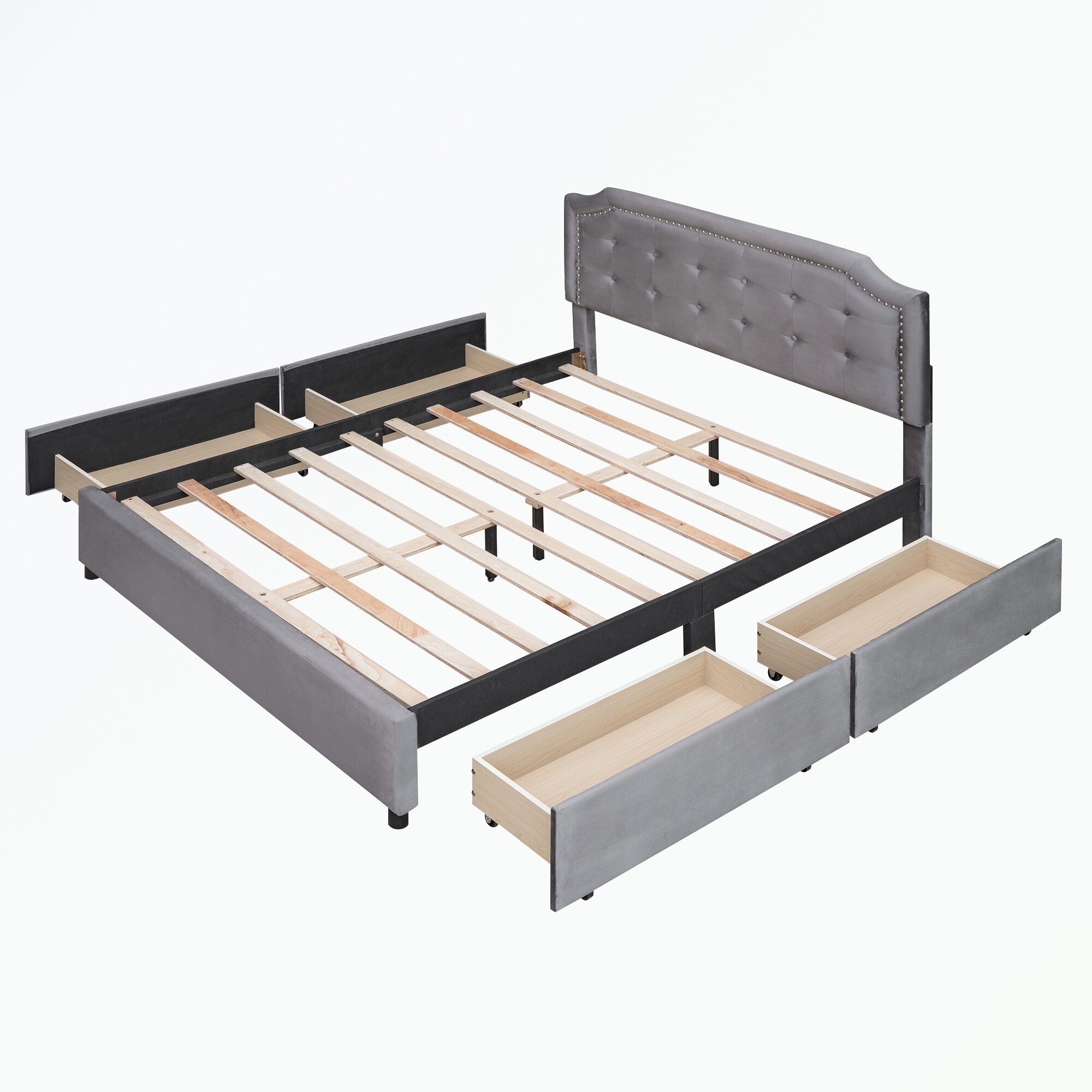 Queen Size Velvet Upholstered Platform Bed with 4 Drawers, Nailhead Trim Headboard and Footboard