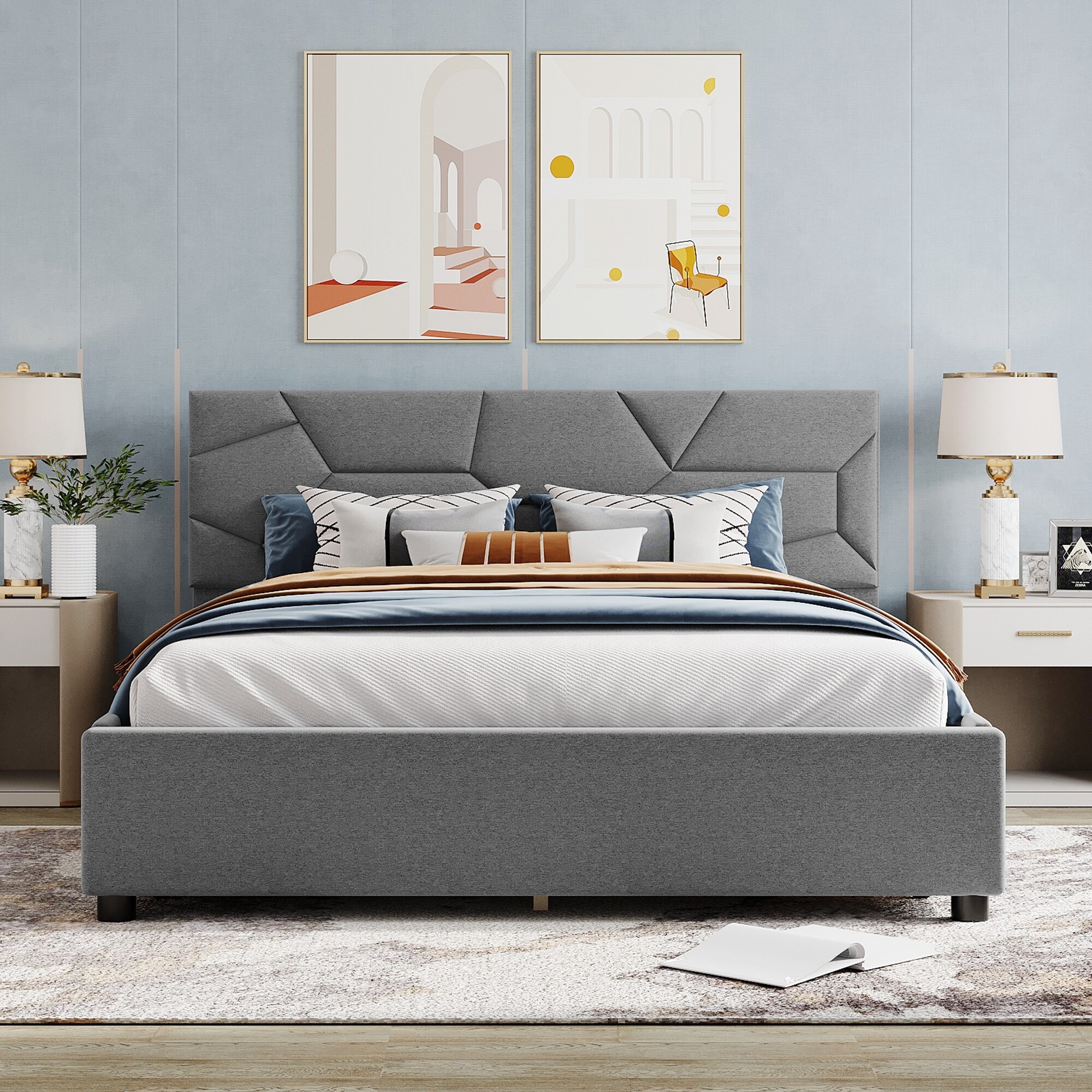 Queen Size Upholstered Linen Platform Bed with Headboard & 4 Drawers