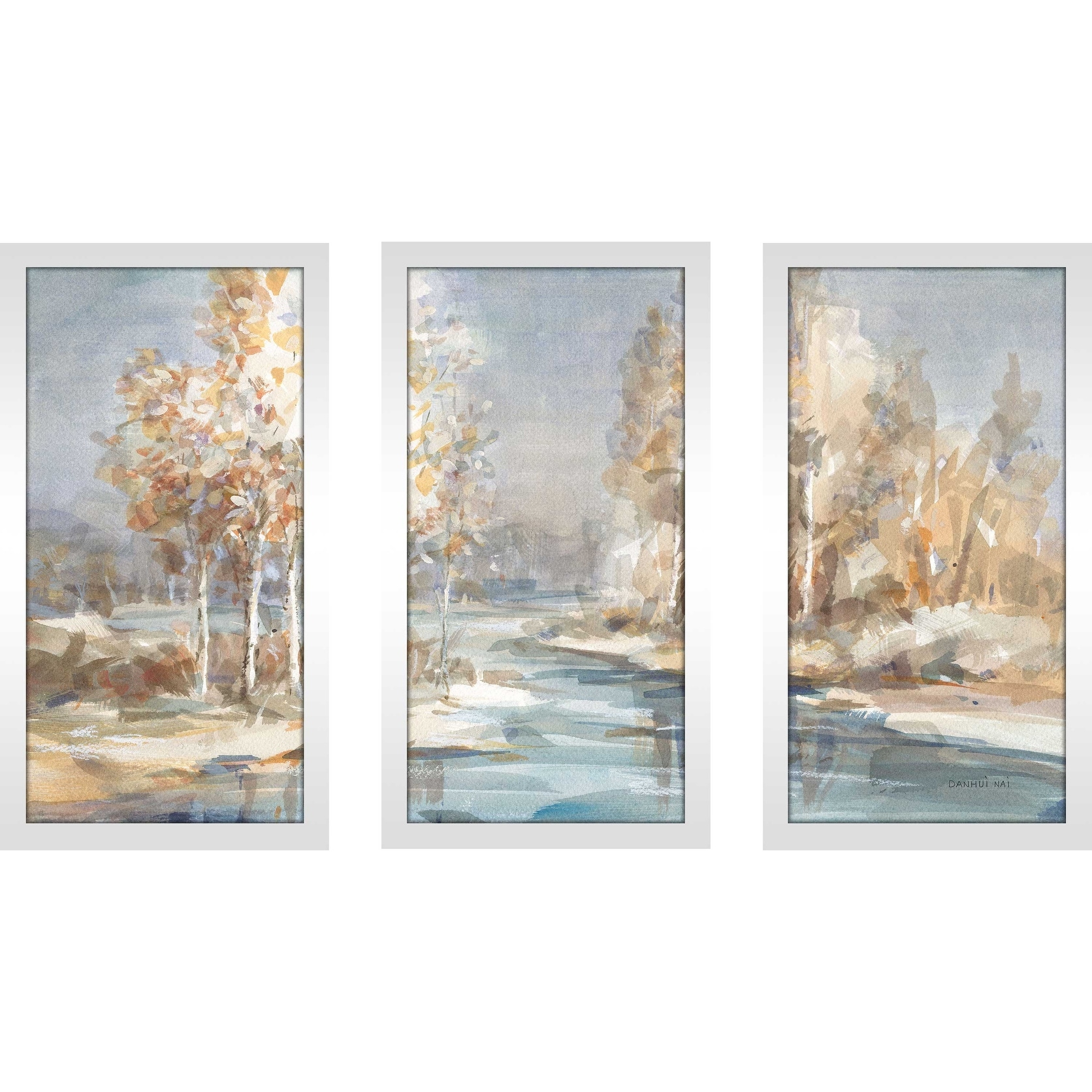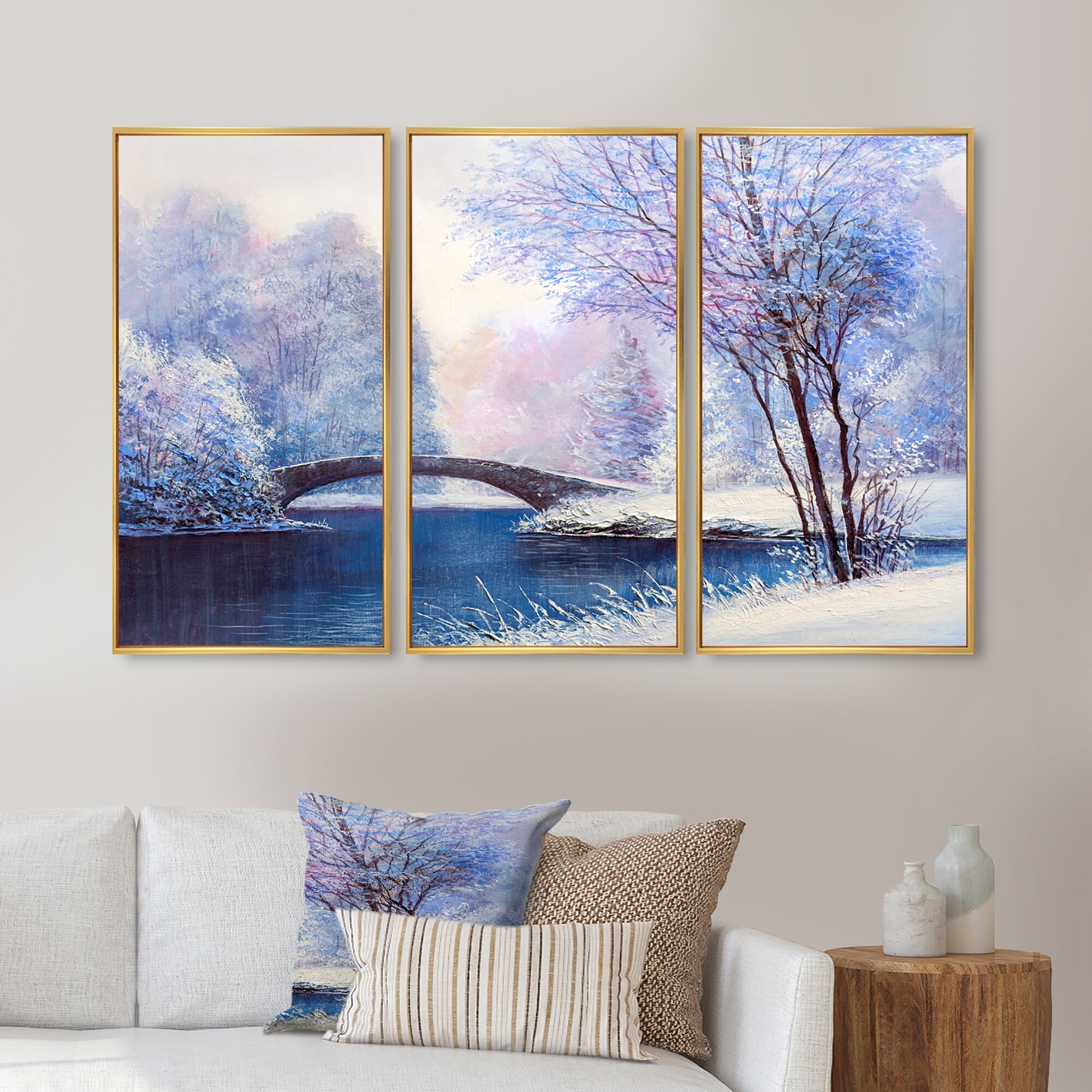 Designart "Winter Scenery With Bridge of Meandering River III" Lake House Framed Artwork Set of 3 - 4 Colors of Frames