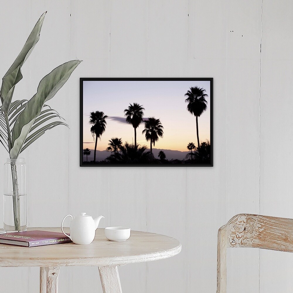 "Silhouette of palm trees at dusk, Palm Springs, Riverside County, California" Black Float Frame Canvas Art - Multi