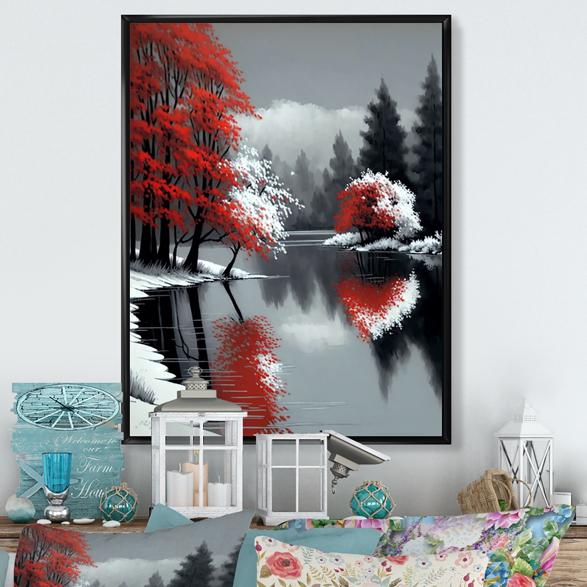 Designart "Snowy Red Trees By the Riverside" Landscape Cottage Lake Mountains Canvas Wall Art